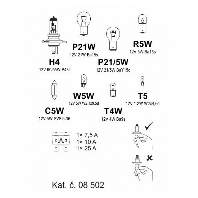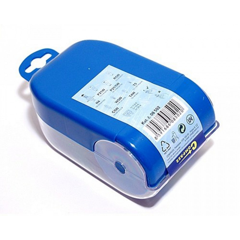 Plastová krabička náhradních autožárovek a pojistek, homologace E.
