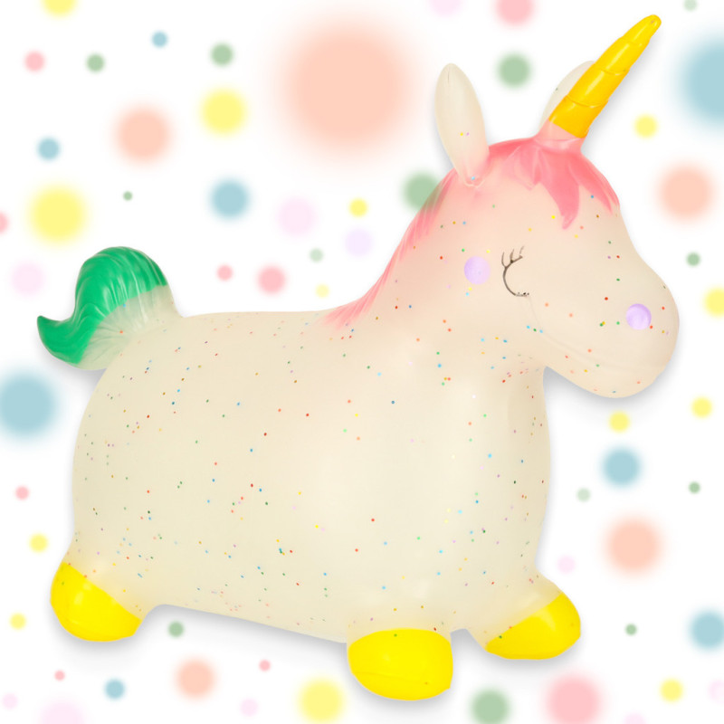 Skákací koník jednorožec – gumová hračka pro zábavu a pohyb dětí.