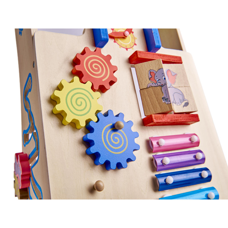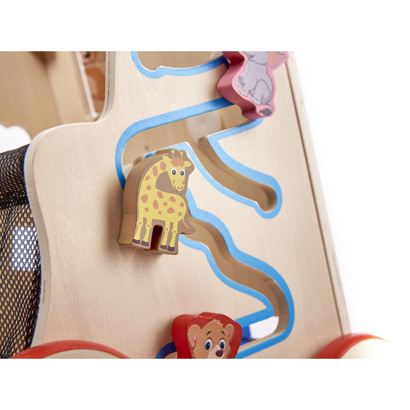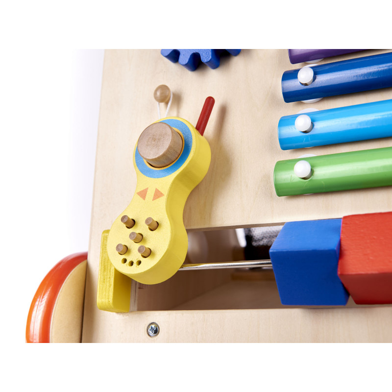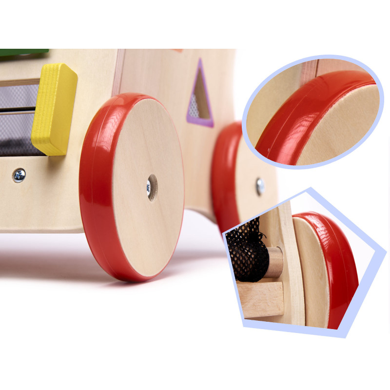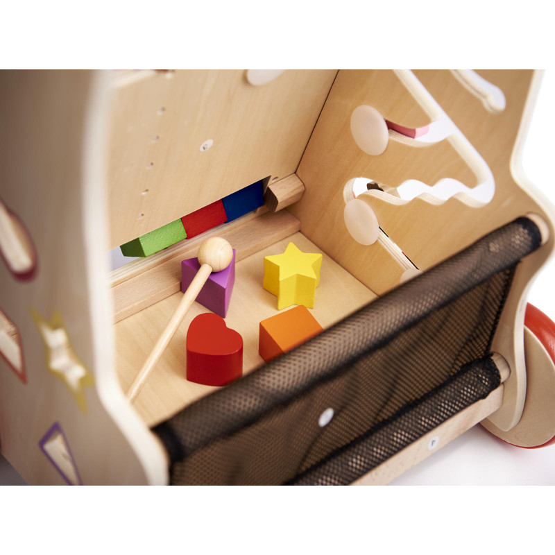 Slouží jako stabilní chodítko, vozík na hračky a vzdělávací panel s interaktivními prvky.