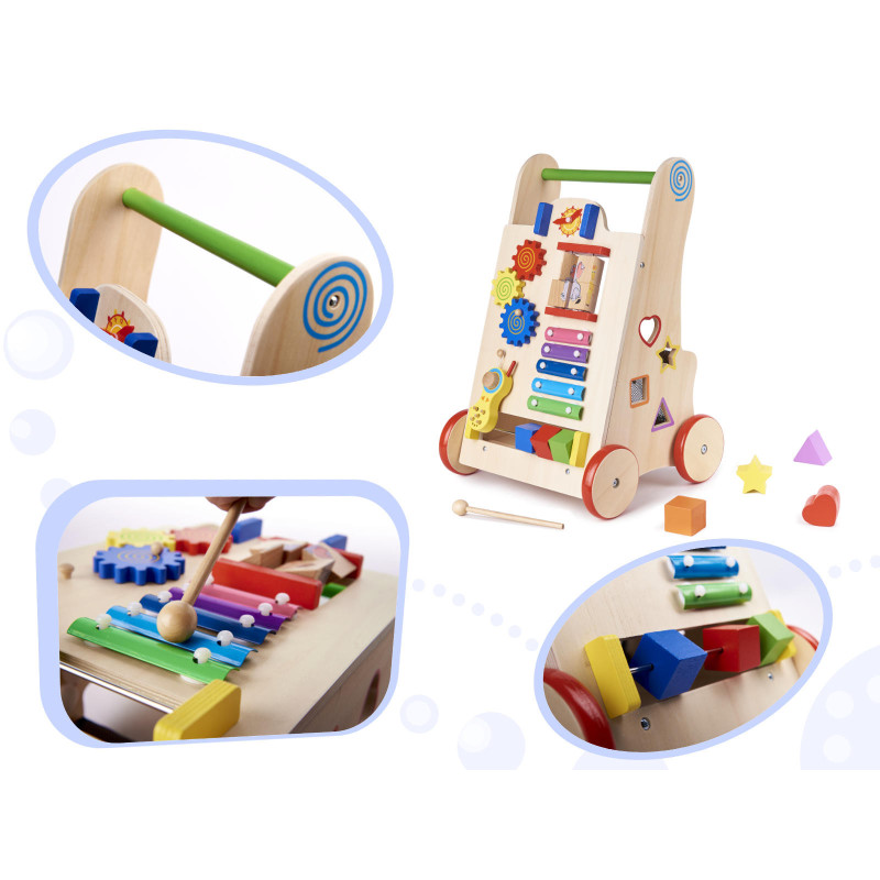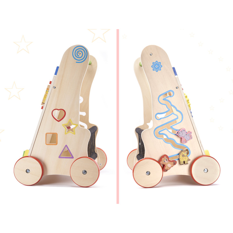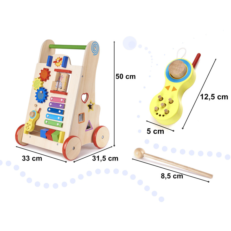 VZDĚLÁVACÍ DŘEVĚNÉ CHODÍTKO 6V1 je multifunkční hračka, která pomůže Vašemu děťátku při prvních krůčcích a zároveň poskytne spoustu zábavy i vzdělávání. Slouží jako stabilní chodítko, vozík na hračky a vzdělávací panel s interaktivními prvky.