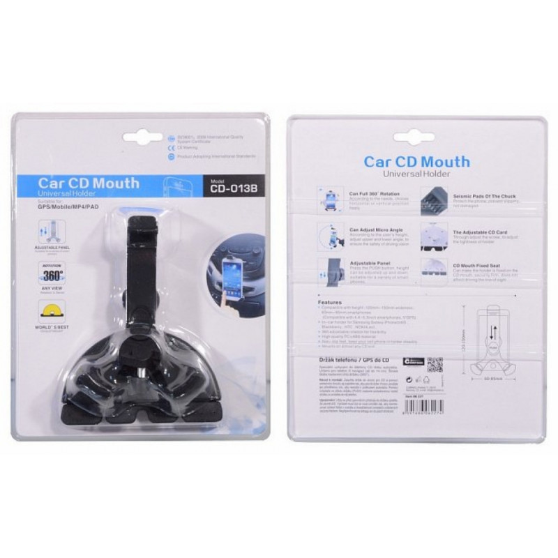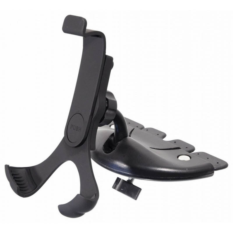 Držák telefonu či navigace, který se připevní do štěrbiny CD disku autorádia. Vhodné pro telefon či navigaci (až do 14 cm). Široká škála nastavení úhlů držáku (360°) umožňuje upnutí telefonu na šířku i na výšku a nastavení libovolného sklonu. Držák se jednoduše zasune do otvoru pro CD a pomocí aretačního šroubu se zajistí tak, aby pevně držel. U běžných autorádií nebrání v přehrávání vloženého CD a autorádio. Jen pro případ vyjmutí či vložení CD disku z/do autorádia je nutné držák sejmout. Pomocí ovladače ve středu držáku (tlačítko PUSH) lze nastavit požadovanou rozteč držáku.