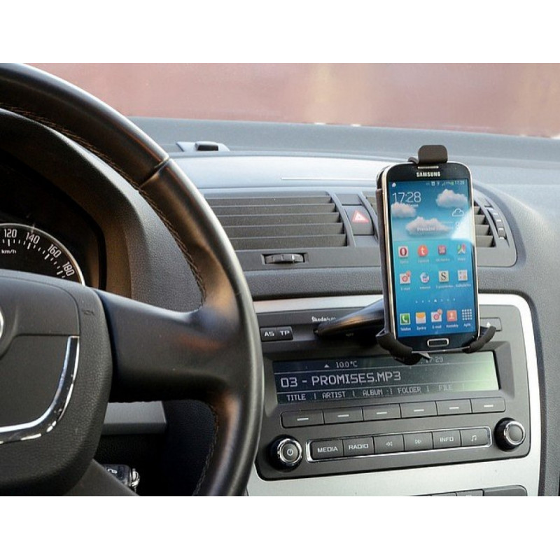 Držák telefonu či navigace, který se připevní do štěrbiny CD disku autorádia. Vhodné pro telefon či navigaci (až do 14 cm). Široká škála nastavení úhlů držáku (360°) umožňuje upnutí telefonu.