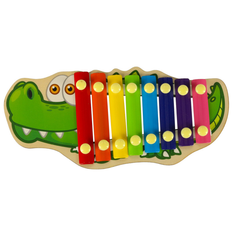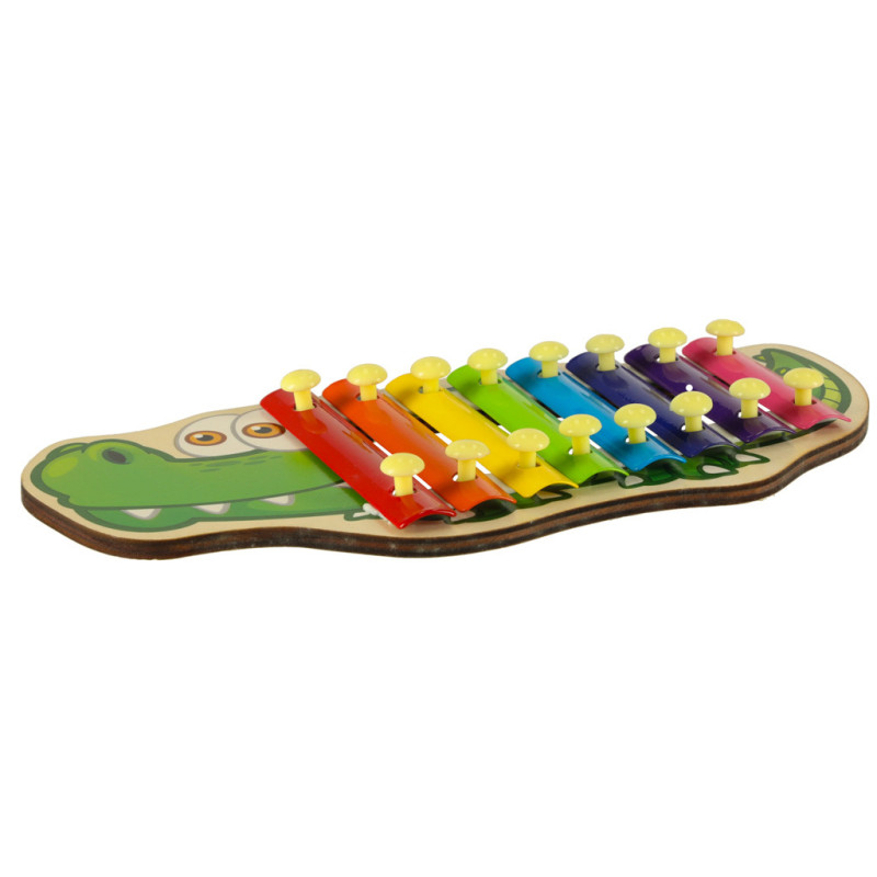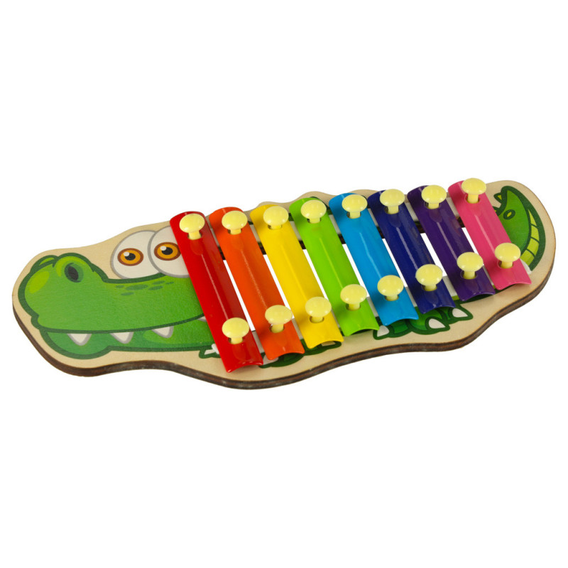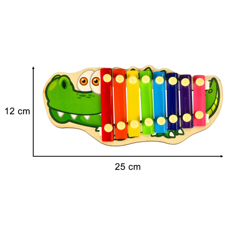 Barevný dřevěný cimbál ve tvaru krokodýla je ideálním hudebním nástrojem pro malé začínající hudebníky. Skládá se z osmi barevných kovových destiček, které vydávají různé tóny a umožňují hraní jednoduchých melodií. Skvělá pomůcka pro rozvoj hudebního sluchu a rytmického cítění dítěte.