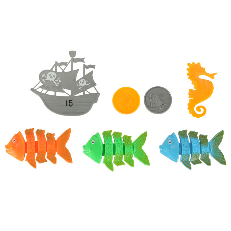 Umístěné v bazénu jsou rybičky, mořští koníci a chobotnice součástí herní aktivity, při níž si dítě může rozvíjet obratnost a motorické dovednosti. Součástí sady jsou potápěčské trubky, které dítěti pomohou vylovit hračky z vody.