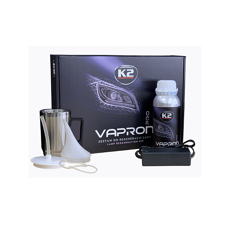 K2 VAPRON PRO – profesionální sada na renovaci světlometů K2 VAPRON PRO je profesionální sada určená k obnově a renovaci plastových světlometů. Efektivně odstraňuje škrábance, zabarvení a matování povrchu, čímž vrací světlometům jejich původní, bezchybný vzhled. Díky obnově původní vrstvy polykarbonátu sada zajišťuje dlouhotrvající a odolnou regeneraci. Výsledkem je nejen estetické vylepšení, ale také zlepšení světelného výkonu a bezpečnosti při jízdě. Produkt je určen výhradně pro profesionální použití.