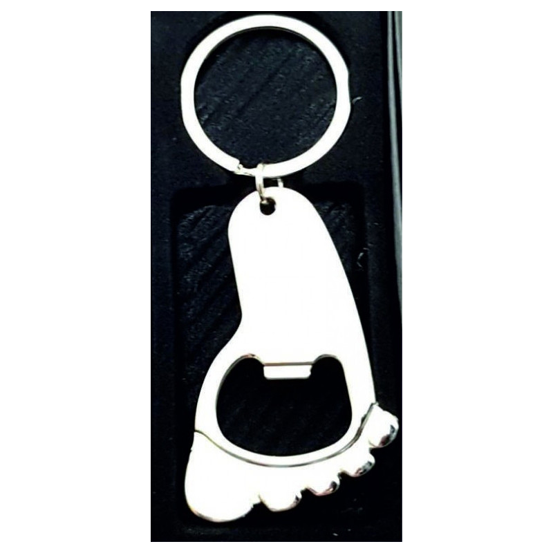 Přívěsek ve tvaru nohy , která slouží jako otvírák, je vyroben z nerezové oceli a je vhodný i jako klíčenka.