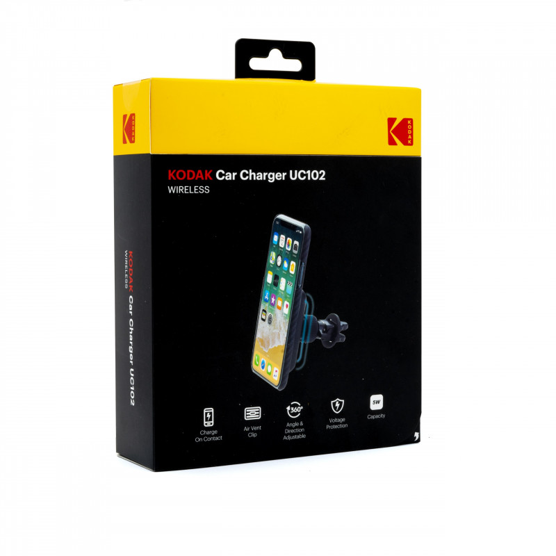 Držák do auta s vestavěnou indukční nabíječkou Kodak. Nabíječka dodává energii telefonu díky indukční technologii (Pokud má telefon funkci indukčního nabíjení, rychlé indukční nabíjení začne chvíli po vložení! Maximální nabíjecí výkon je až 5W).