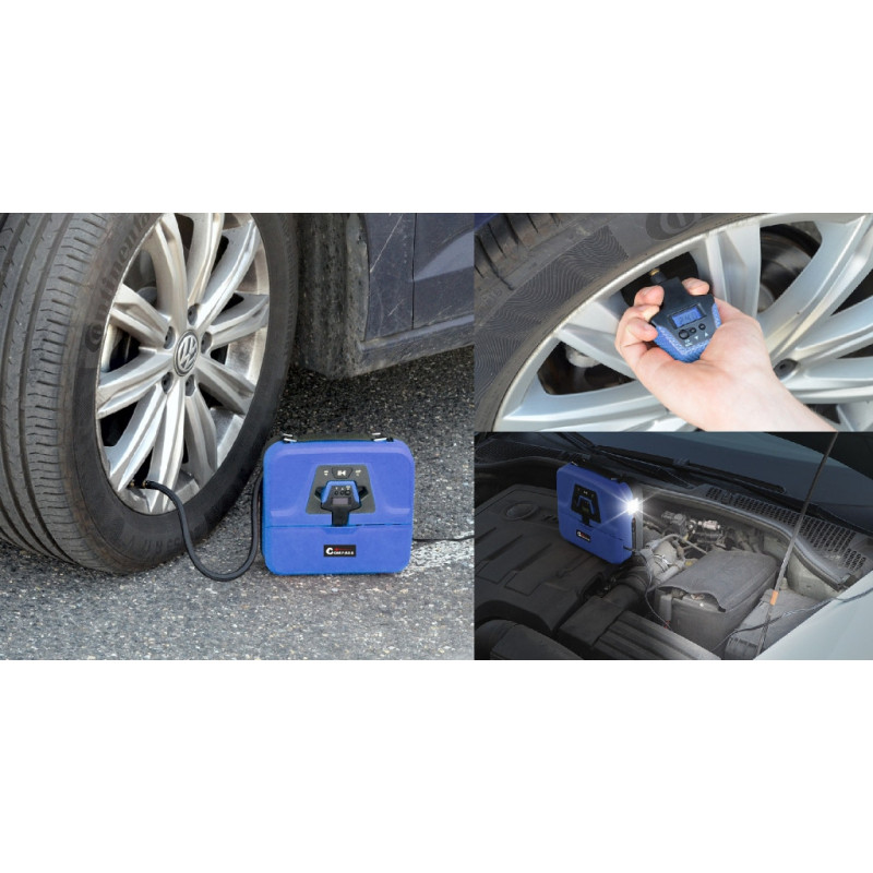 Digitální vzduchový kompresor v kompaktním provedení. Napájení 12V, dlouhý kabel se zástrčkou do autozapalovače. Adaptéry pro huštění míčů, matrací nebo bazénů, 4x náhradní čepička na ventil Auto stop - kompresor nahustí pneumatiku na předem nastavený tlak a následně automaticky kompresor vypne. Vestavěný odnímatelný pneuměřič, zobrazuje naměřený tlak v několika různých jednotkách. Vestavěné svítidlo 9x LED pro osvětlení pracovního prostoru. Před použitím důkladně přečtěte přiložený návod.