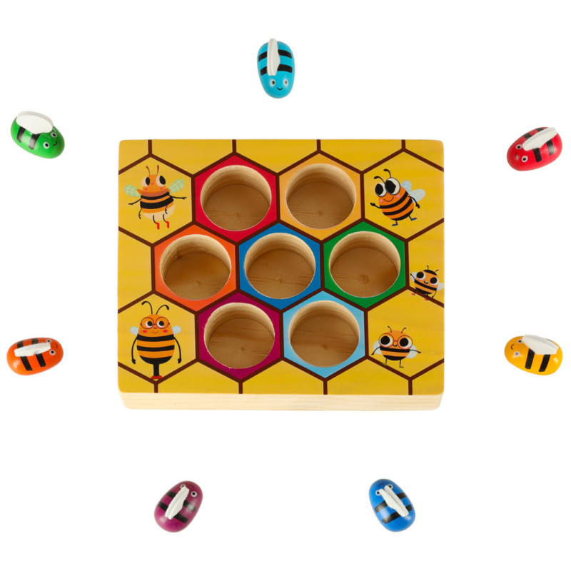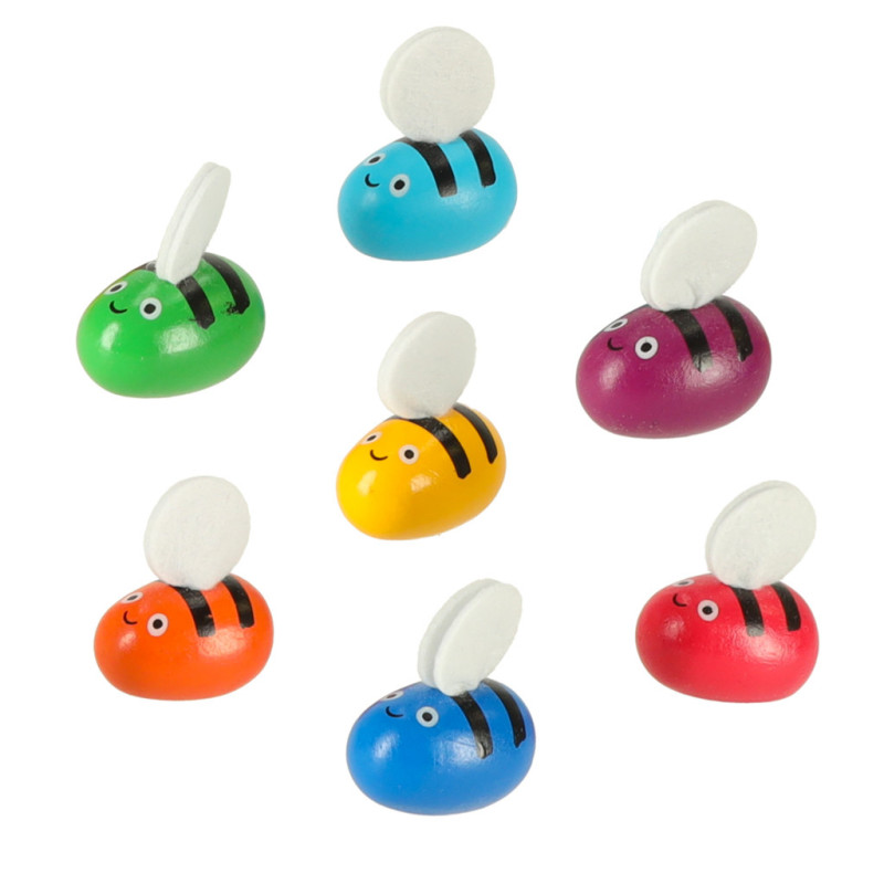 Sada obsahuje 7 barevných dřevěných včelek a herní podložku s motivem včelí plástve.