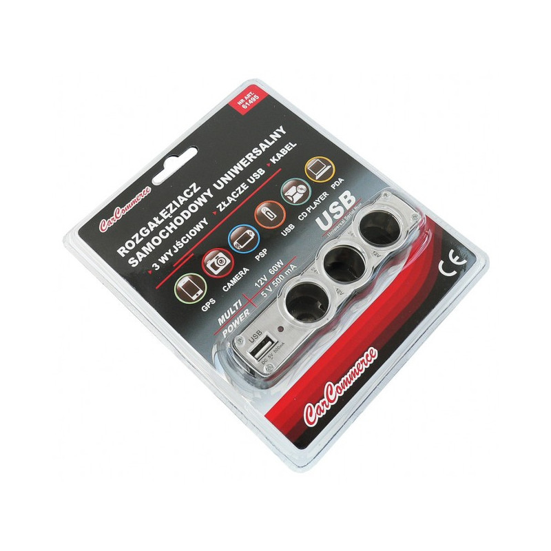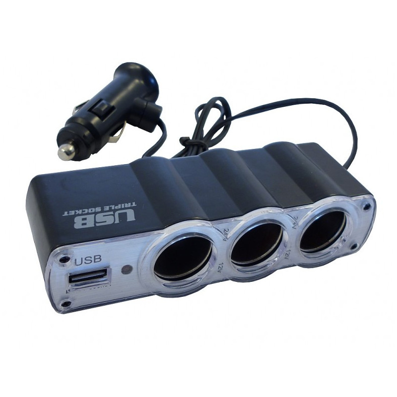 Multi zásuvka zapalovače 3+1 USB s kabelem 12/24 V Rozměry: VSTUP ---> 12/24 V - standard VÝSTUP ----> 3 x 12/24 V - standard - 5 A total 1 x 5 V - USB - 1 A total
