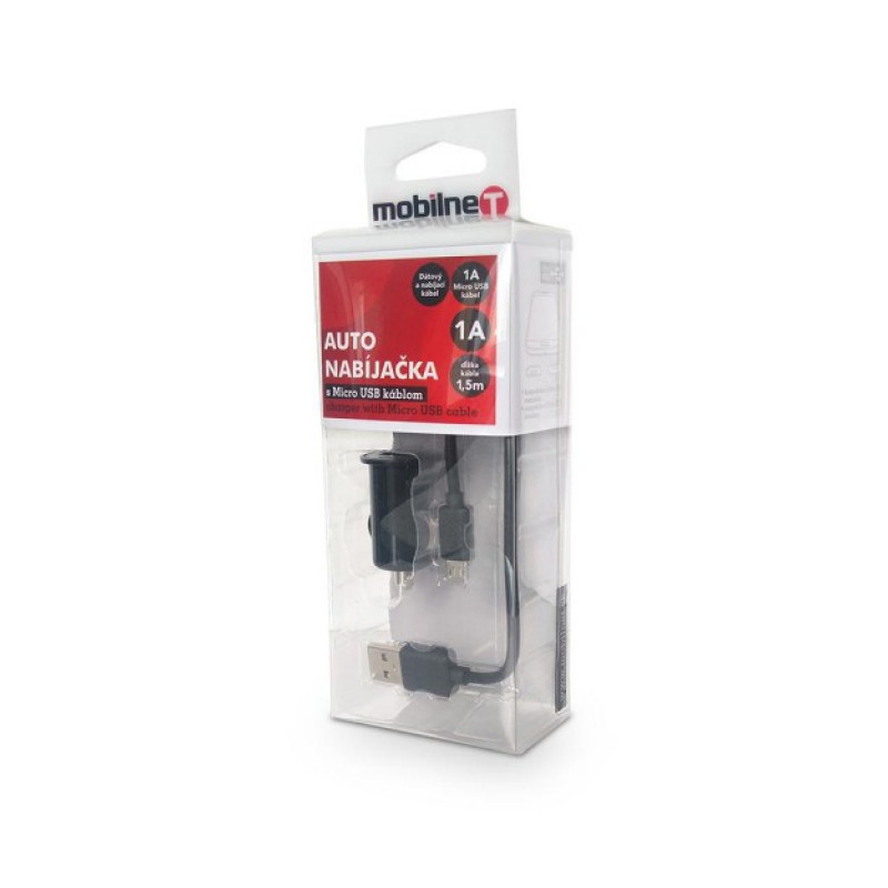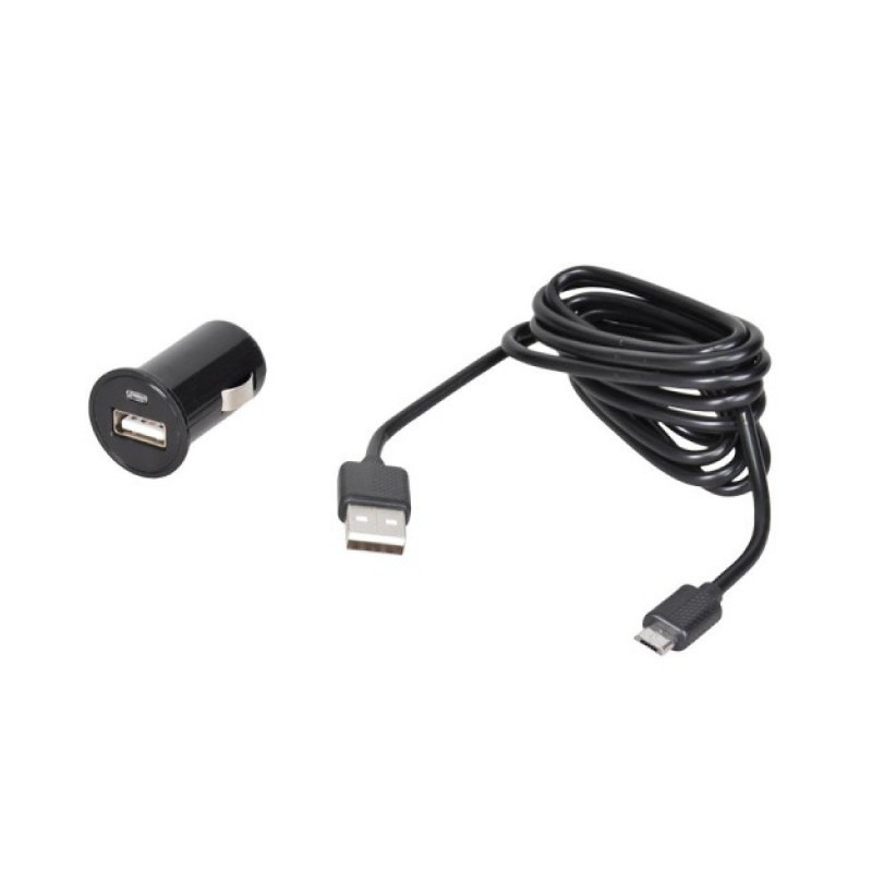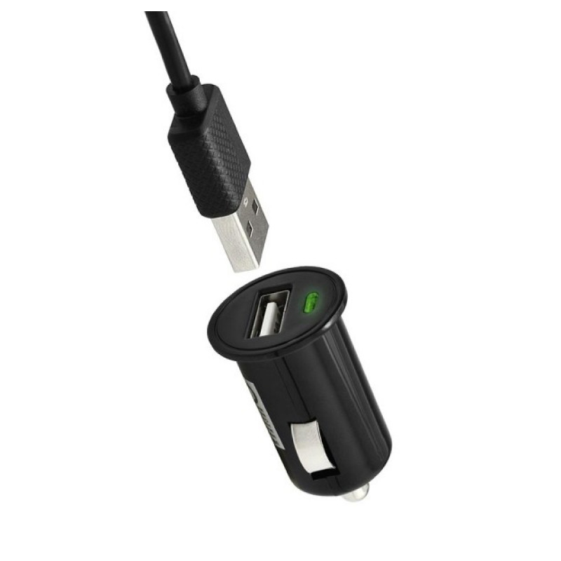 Kompaktní USB autonabíječka na mobil univerzálně použitelná s odpovídajícím nabíjecím kabelem.