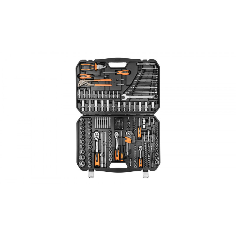 NEO Nástrčné klíče - největší sada v nabídce. Zahrnuje 233 kusů velikosti 1/2', 3/8' a 1/4'. Je vyrobena z vysoce kvalitní chrom-vanadiové oceli. Klíče se dodávají v pohodlném a odolném plastovém kufříku s kovovými svorkami a pohodlnou rukojetí. Uvnitř se nachází kompletní sada nářadí: šestihranné nástavce (mělké a hluboké), nástavce E, bity (různé konfigurace včetně prodloužení pro šrouby v hlubokých nástavcích), šestihranné klíče, kombinované klíče (velikosti od 8 do 22 mm), adaptéry pro vr. , 4 zásuvky pro zapalovací svíčky, příslušenství. Součástí sady jsou také šroubováky, kombinované kleště a kleště na trubky, které umožňují práci v situacích, které vyžadují nestandardní řešení. Račně se skloněnou rukojetí (3 kusy) mají 72 zubů, které umožňují práci v omezeném prostředí. Kvalitu a spolehlivost nářadí potvrzuje 25letá záruka a mezinárodní certifikát TÜV. Značka NEO splňuje očekávání profesionálů.