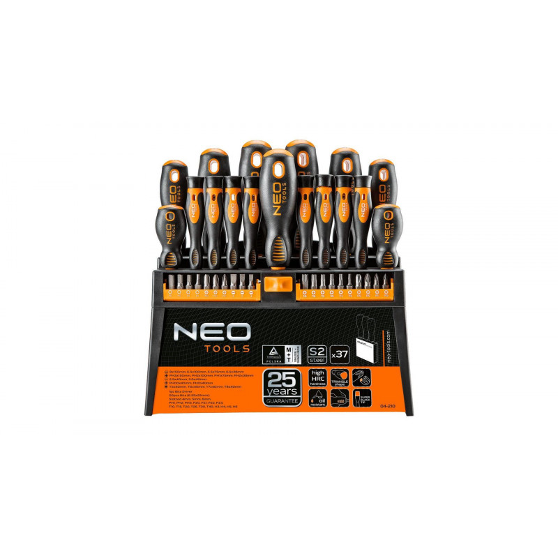 NEO Sada šroubováků a šroubovacích nástavců obsahuje 37 kusů nejvyšší kvality. Hrot šroubováků je vyroben z mimořádně odolné oceli S2, která zaručuje dlouhou životnost. Šroubováky mají magnetický hrot. Tvar tříramenné rukojeti s profilovanou opěrkou na palec snižuje námahu při práci a usnadňuje dosažení správného točivého momentu. Protiskluzová rukojeť vyrobená ze dvou materiálů je odolná vůči chemikáliím, olejům a tukům. Kvalita nástroje je potvrzena zárukou výrobce na 25 let. Uloženo v praktickém stojanu, což usnadňuje skladování. Značka NEO splňuje očekávání profesionálů.