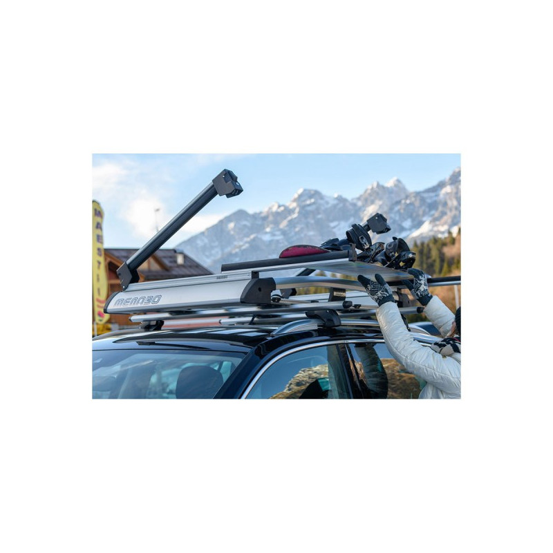 YELO je špičkový nosič lyží Menabo určený pro šest párů lyží nebo čtyři snowboardy, ale vybavení lze uspořádat v různých kombinacích. Je velmi funkční a bezpečný, vyrobený z hliníku a odolného plastu, je vybaven posuvnou základnou, která usnadňuje nakládání a vykládání lyží a snowboardů. Použití je rychlé a snadné: jedním cvaknutím odklopíte rameno, zvednete ho a druhým cvaknutím vysunete základnu. YELO lze snadno namontovat na všechny typy střešních nosičů pomocí standardních 20mm (0,78„) T-šroubů nebo alternativně pomocí 60mm (2,36“) U-šroubů. V neposlední řadě je vybaven dvojitým systémem proti krádeži jak nosiče, tak lyží/snowboardů.