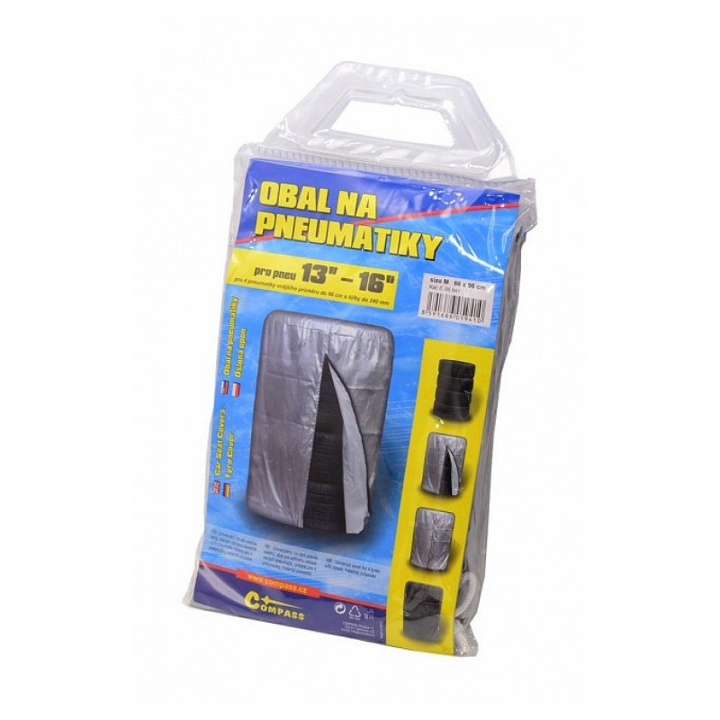 Obal (plachta) na 4 pneumatiky, na zip uzavíratelný. Velikost 66 x 96 cm, vhodné pro 13 - 16" pneumatiky vnějšího průměru do 66 cm a šířky pneu do 240 mm.
