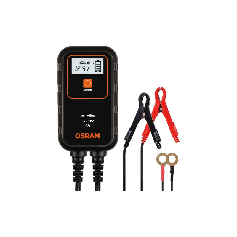 OSRAM BATTERYcharger 904 je inteligentní nabíječka s funkcí udržování baterie 4A pro 6V a 12V vozidla, včetně motocyklů a většiny menších vozidel. 7stupňový nabíjecí cyklus jednoduchým stisknutím tlačítka pro lithiové baterie a 9stupňový cyklus pro olověné / AGM baterie. Připojte a ujistěte se, že nabíječka autobaterie udržuje vaši autobaterii, protože se automaticky přizpůsobí režimu dlouhodobé údržby, jakmile je baterie nabitá. Nabíječka obsahuje digitální displej, který usnadňuje proces nabíjení, a řadu bezpečnostních prvků, včetně ochrany proti přepólování a ochrany proti zkratu.