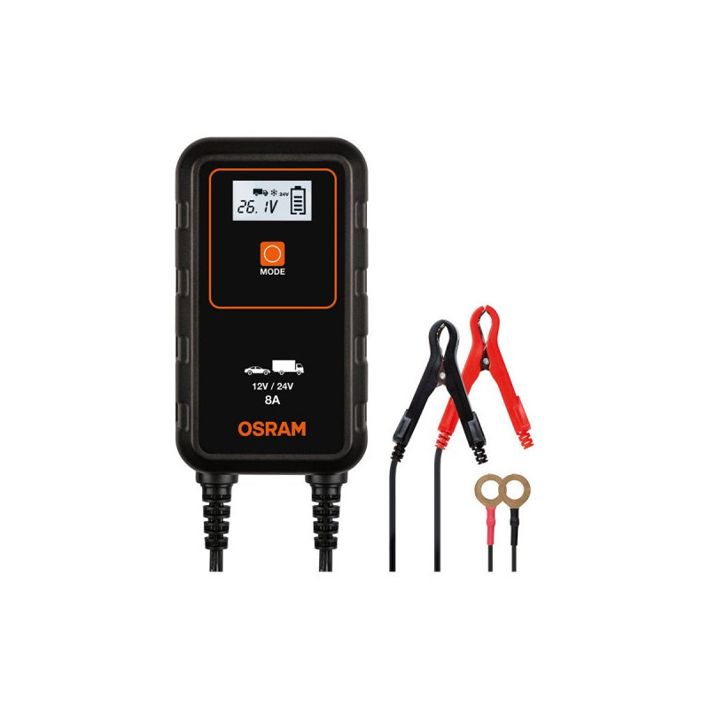 OSRAM BATTERYcharger 908 je 8A inteligentní nabíječka a údržba baterií pro 12V a 24V vozidla včetně většiny osobních automobilů, dodávek a malých nákladních vozidel. Udržuje a nabíjí baterii vozidla prostřednictvím 7stupňového nabíjecího cyklu stisknutím tlačítka pro lithiové baterie, pouze s 9stupňovým cyklem pro olověné/AGM baterie. Obsahuje digitální LCD displej s podsvícením, díky kterému bude vše jednoduché i při slabém osvětlení. Řada bezpečnostních prvků včetně přepólování a ochrany proti zkratu zajišťuje bezpečnost uživatele i vozidla. Ujistěte se, že nabíječka udržuje vaši autobaterii, protože se automaticky přepne do režimu dlouhodobé údržby, jakmile je baterie vozidla plně nabitá.