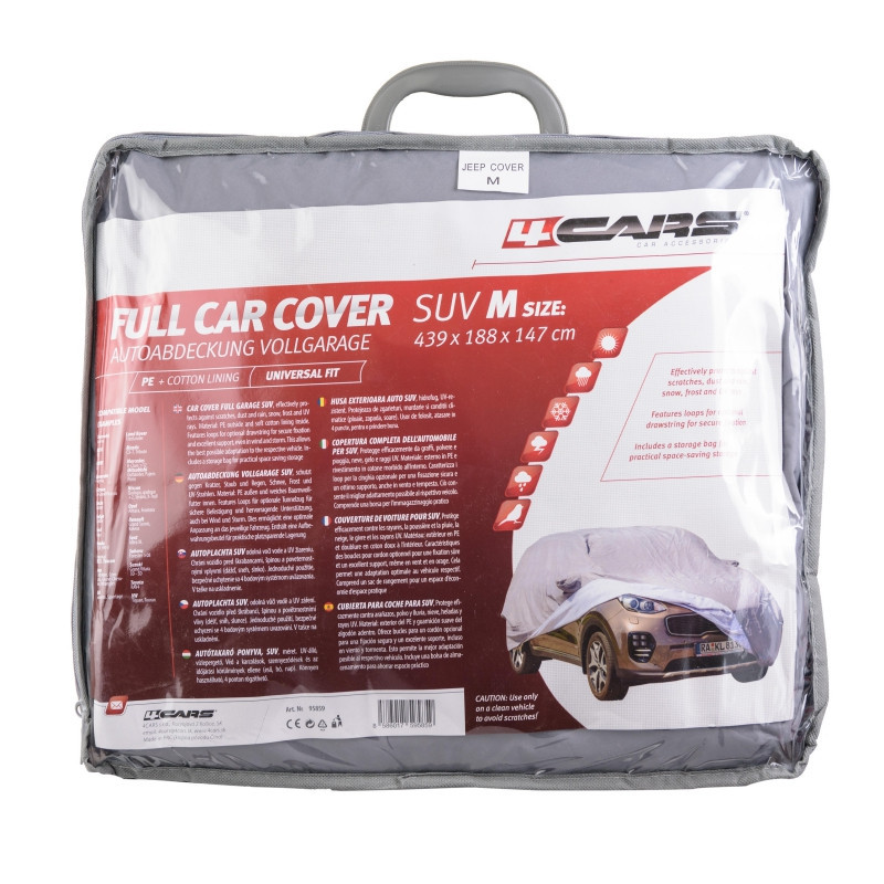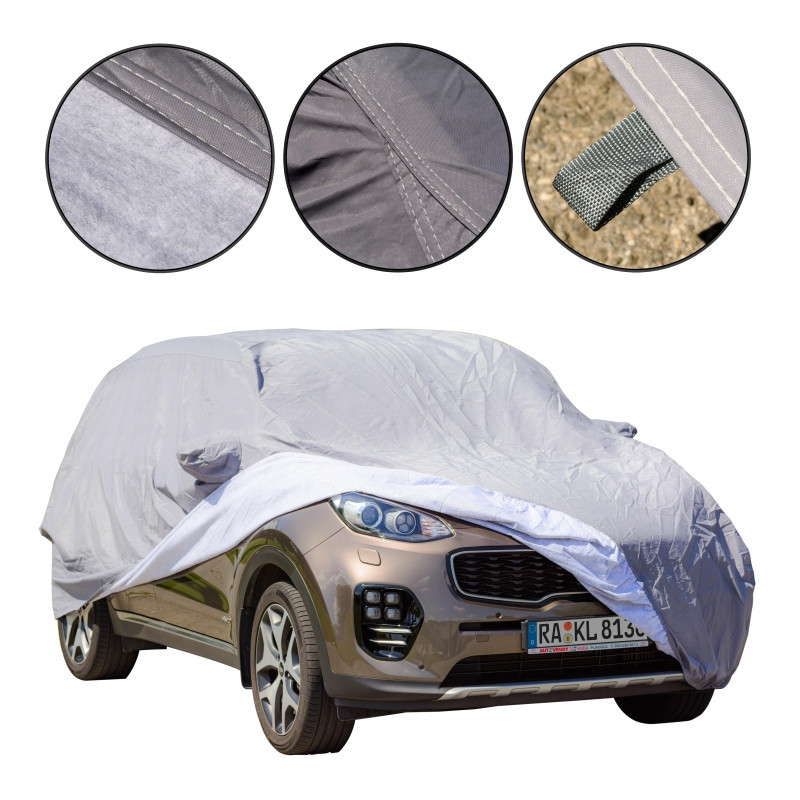Nepromokavá plachta na auto chrání Váš automobil za deště, sněhu nebo prudkého slunce. Zabraňuje vyblednutí barvy vlivem počasí. Ochrání auto před slunečním zářením. 4-bodový systém upevnění díky všité gumě pro bezpečné uchycení autoplachty. Voděodolný, užitkový nebo úložný vak (v praxi široké použití např. zabalení předmětů).