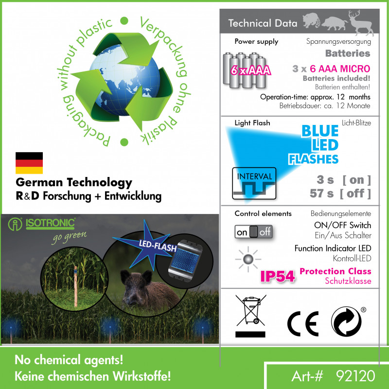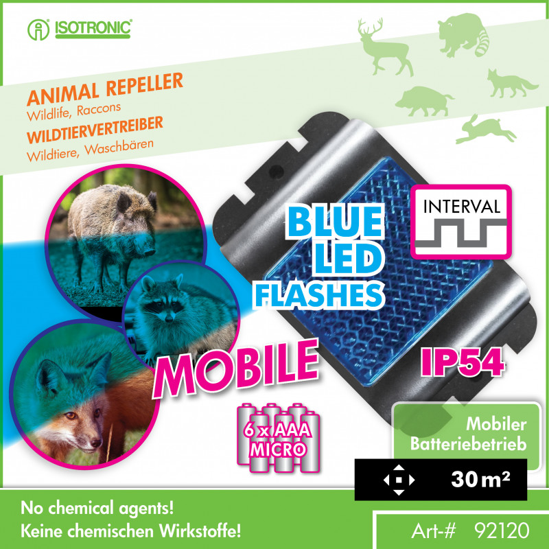 Batériové, mobilné a vysoko efektívne. Už sa nemusíte obávať nežiaducich návštev divých zvierat, ako sú jelene, líšky a diviaky vo vašom okolí. Odpudzovač divých zvierat ISOTRONIC Mobil používa modré reflexné LED svetlo, aby zvieratá neboli v dosahu poľa, lesa, domu, garáže, stodoly alebo záhrady. Integrované intervalové prepínanie na 60 sekúnd zabráni zvieratám v priblíženiu.