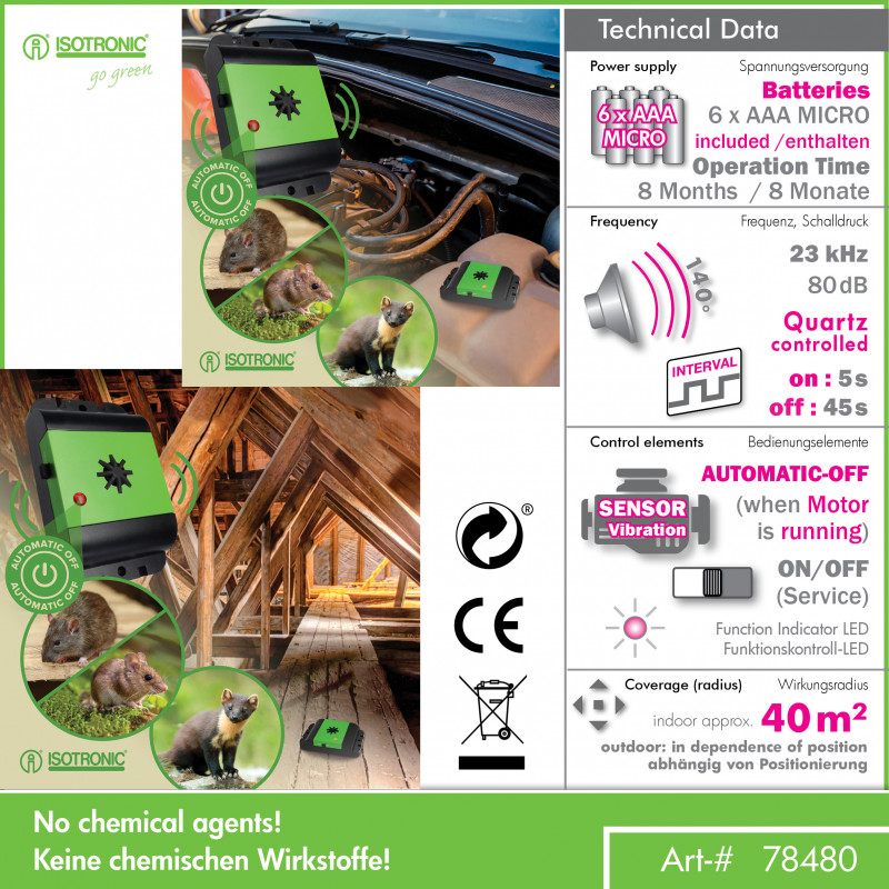 Tento jedinečný plašič využívá nejmodernější technologii ultrazvukových frekvenčních signálů, které bezhlučně a netoxicky dokáží ochránit vaše auto, dům, garáž, chalupu a jiné . Po zapnutí vydává odpuzovač zvuk s proměnlivou frekvencí. Signály ovlivňují nervový systém zvířat. Vyvolávají strach, úzkost a nedostatek orientace v terénu. Zvířata raději opustí tento prostor. Přístroj je bezúdržbové bezdrátové zařízení, odolné vůči změnám povětrnostních podmínek.