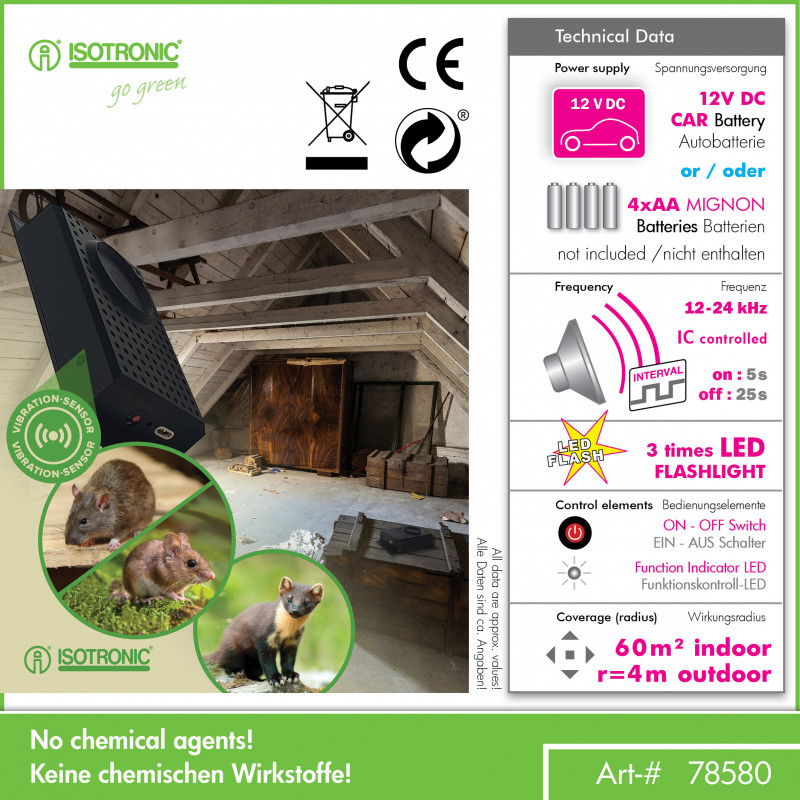 Vysoce účinný přístroj generuje agresivní ultrazvukový signál ve frekvencích 12kHz v 60 sekundových intervalech. Tento signál je kunám a hlodavcům velmi nepříjemný a proto se mu vyhýbají. Vysoké ultrazvukové tóny nejsou pro lidi slyšitelné. Jelikož je napájen i bateriemi můžete jej použít kdekoli potřebujete-vozidlo, interiér domu, garáž, půda, komora a pod.