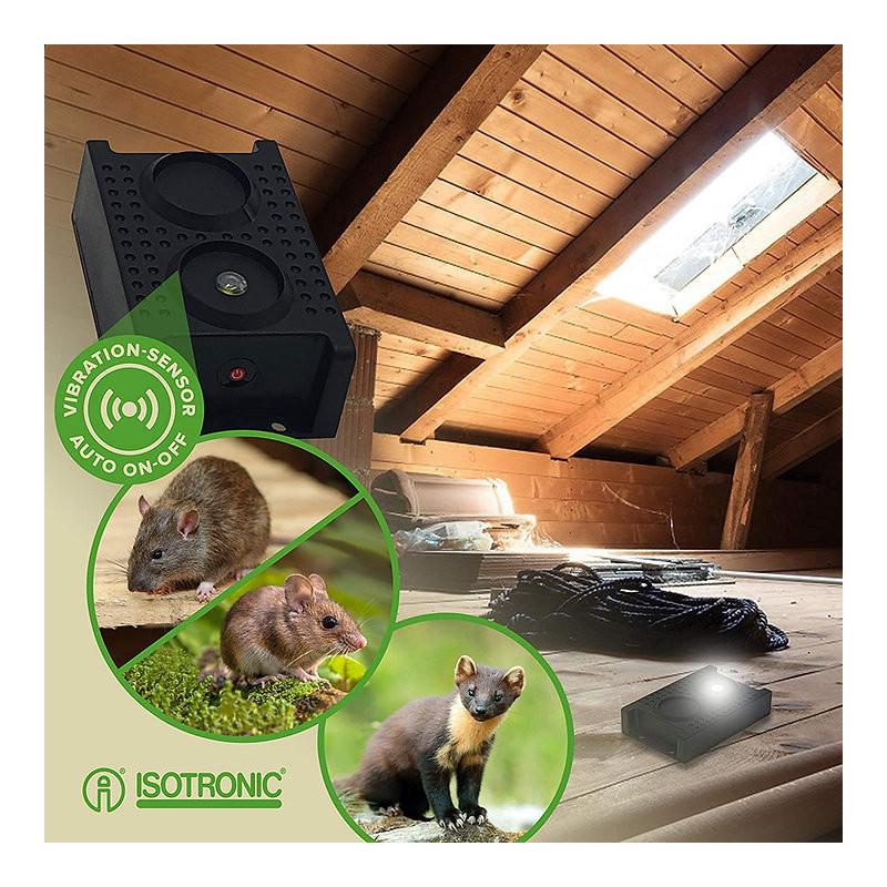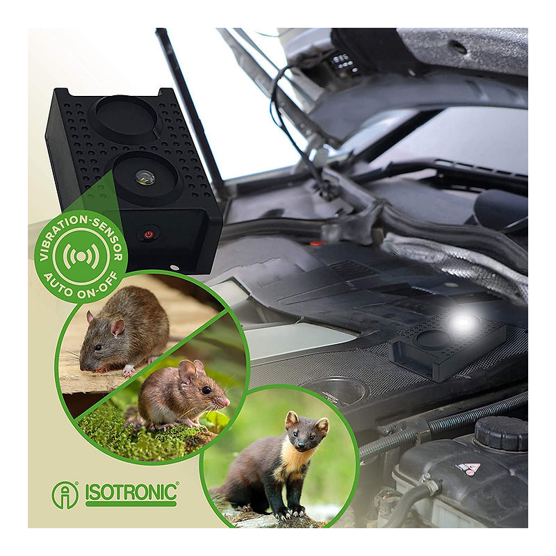 Repelent na kuny/myši se zvukovým signálem a LED diodou. Zařízení odesílá v intervalech cca. 50 sekund akustický signál. Frekvence 12 – 24 kHz má nepříjemný vliv na zvířata, jako jsou myši, kuny. Vestavěná LED dioda generuje 3x LED blesk každou minutu