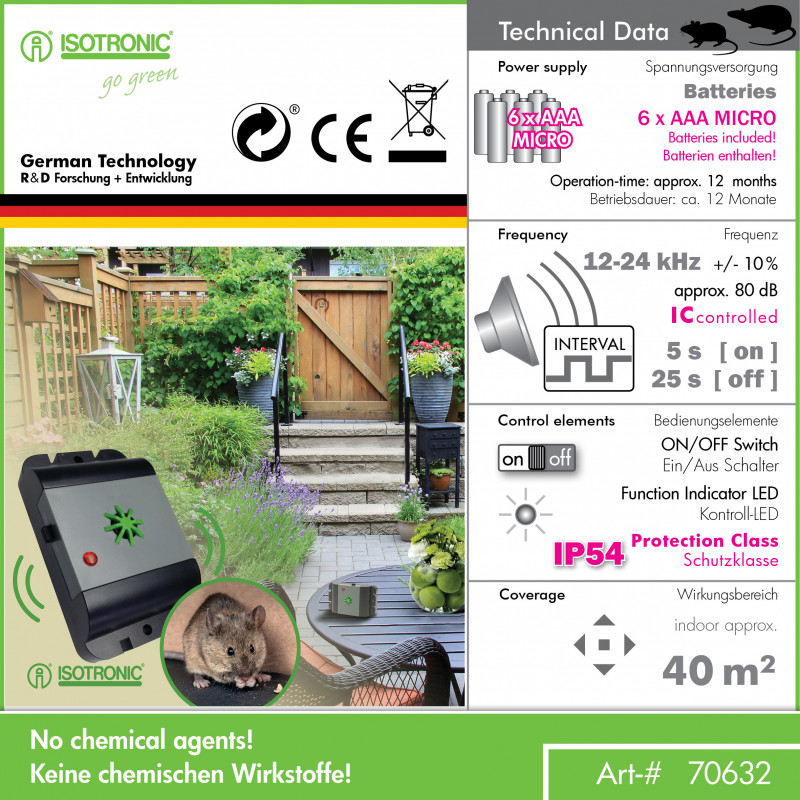Odpuzovač - plašič ISOTRONIC slouží k ochraně prostoru, ve kterém je umístěn před hlodavci a kunami. Je tedy možné jej využít jako odpuzovač-plašič myší, potkanů, krys, kun a lasiček. Generuje specifické ultrazvukové signály na vysokém ultrazvukovém kmitočtu, které jsou pro drobné hlodavce a kuny velmi nepříjemné, takže po krátké době chráněný prostor opouštějí a hledají si nové útočiště v jiných objektech, které nejsou chráněny.