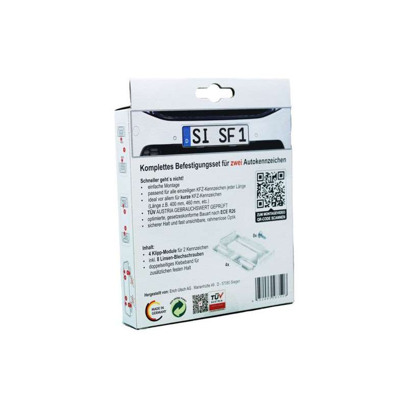 Nová univerzální montážní sada Simple-Fix nabízí optimální možnost snadného upevnění přední a zadní registrační značky bez zbytečného vrtání, přitom je jednoduchá a bezrámová - téměř neviditelná v průhledném provedení, testováno TÜV!