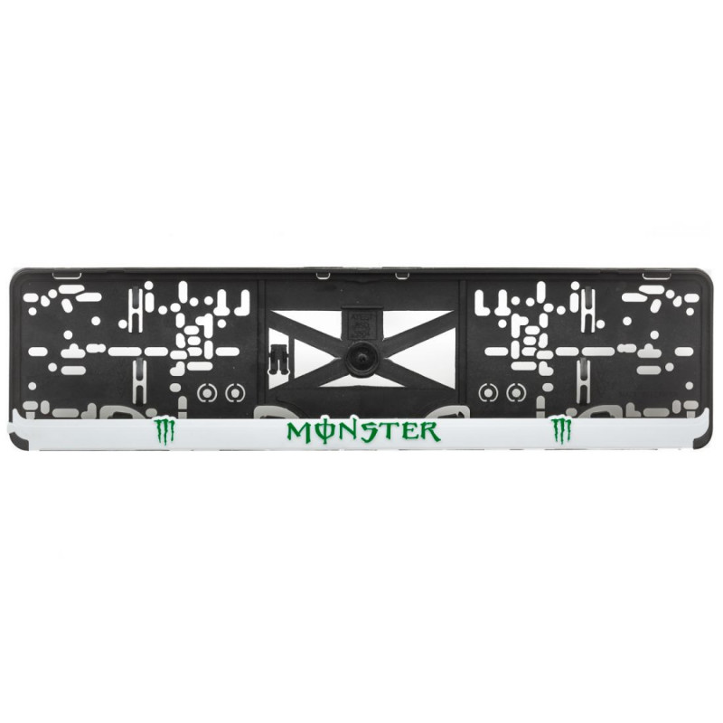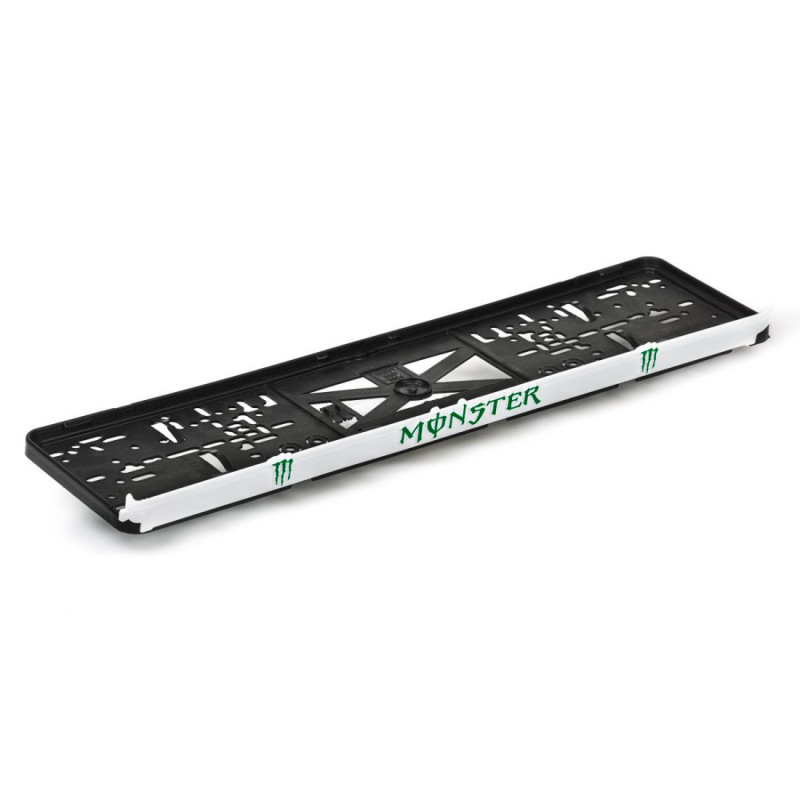 Podložka pod SPZ s 3D zeleným nápisem a logem značky MONSTER na bílé liště