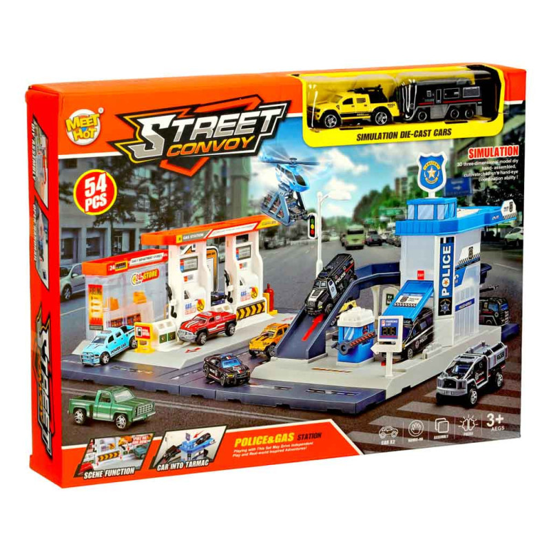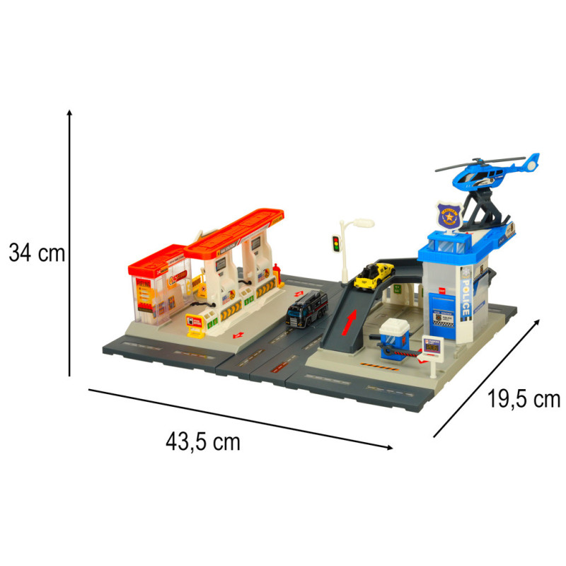Čerpací stanice a policejní parkoviště v jedné sadě přináší dětem hodiny zábavy a zároveň rozvíjí jejich dovednosti. Sada obsahuje 54 prvků, včetně dvou vozidel a vrtulníku, které umožní vytvářet napínavé městské příběhy a akce.