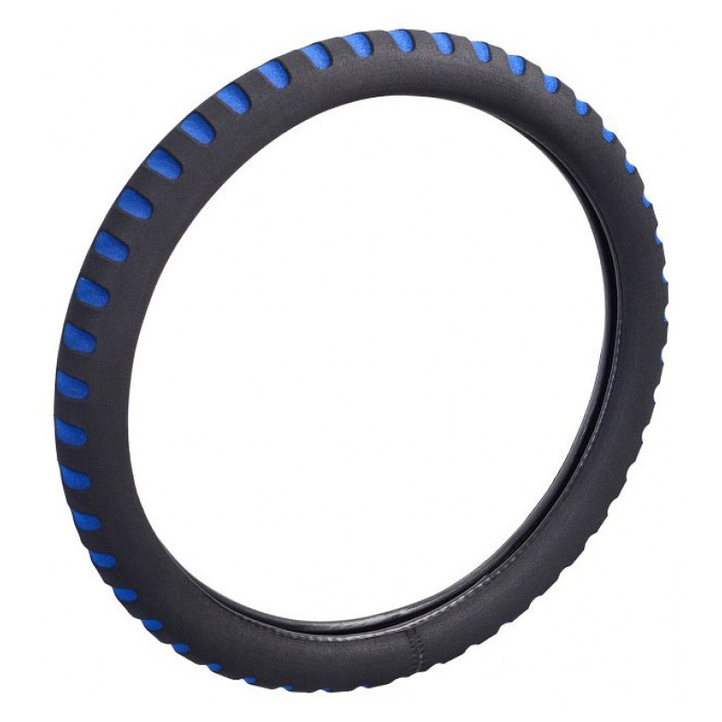 Pěnový potah určený k nasazení na volant o průměru 37-39cm. Příjemný do ruky. Barva černá s modrými prolisy.