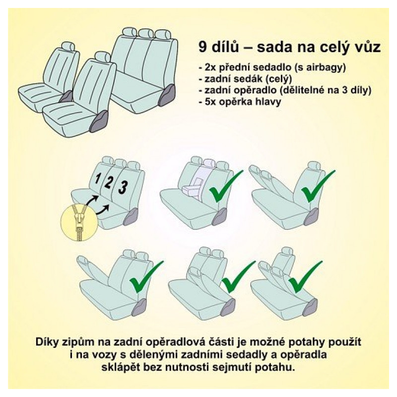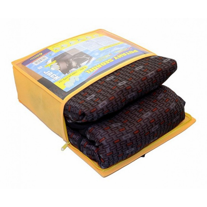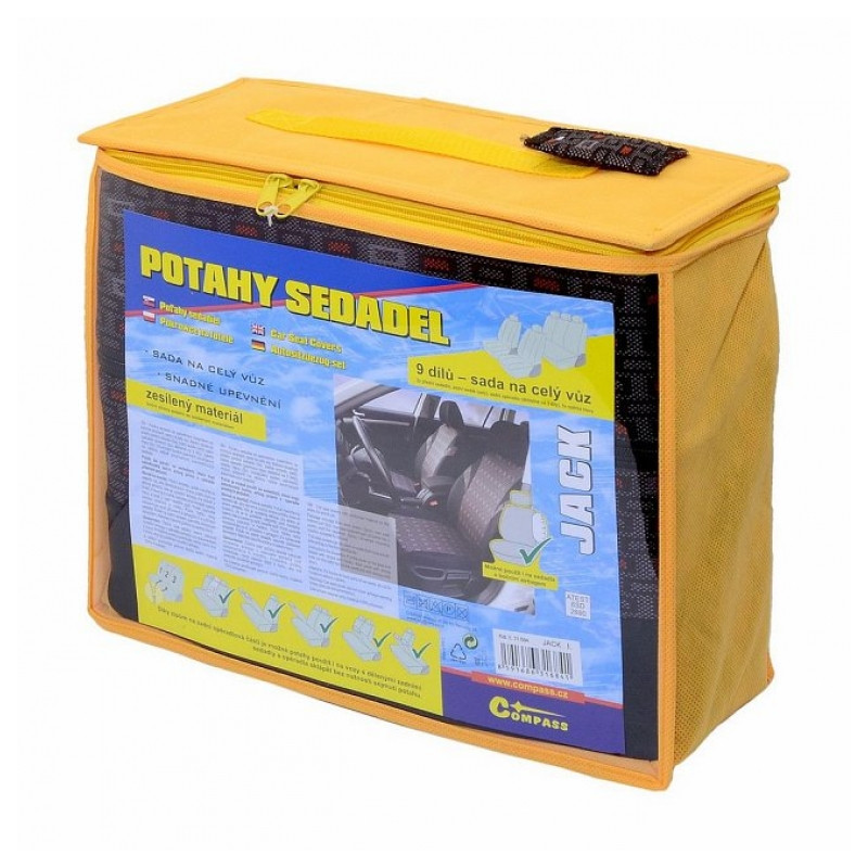 Potahy sedadel JACK, sada na celý vůz. Potah je vyroben ze zpevněného podšitého materiálu v celé ploše, lze připevnit na většinu běžně používaných automobilových sedadel. Potah lze použít na sedadlech, která mají zabudovaný boční airbag přímo v opěradle předních sedadel. Balení obsahuje potah na přední sedátko (2x), zadní sedák (celý), zadní opěradlo (pomocí zipu dělitelné na 3 díly), opěrku hlavy (5x). Díky zipům na zadní opěradlové části lze potahy použít i na vozidla s dělenými zadními sedadly a opěradla sklápět bez nutnosti sejmutí potahu.