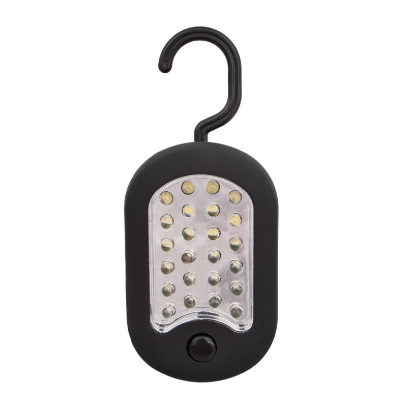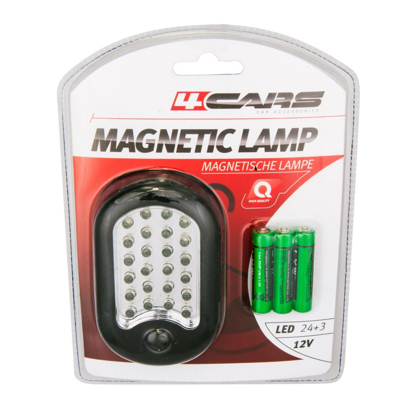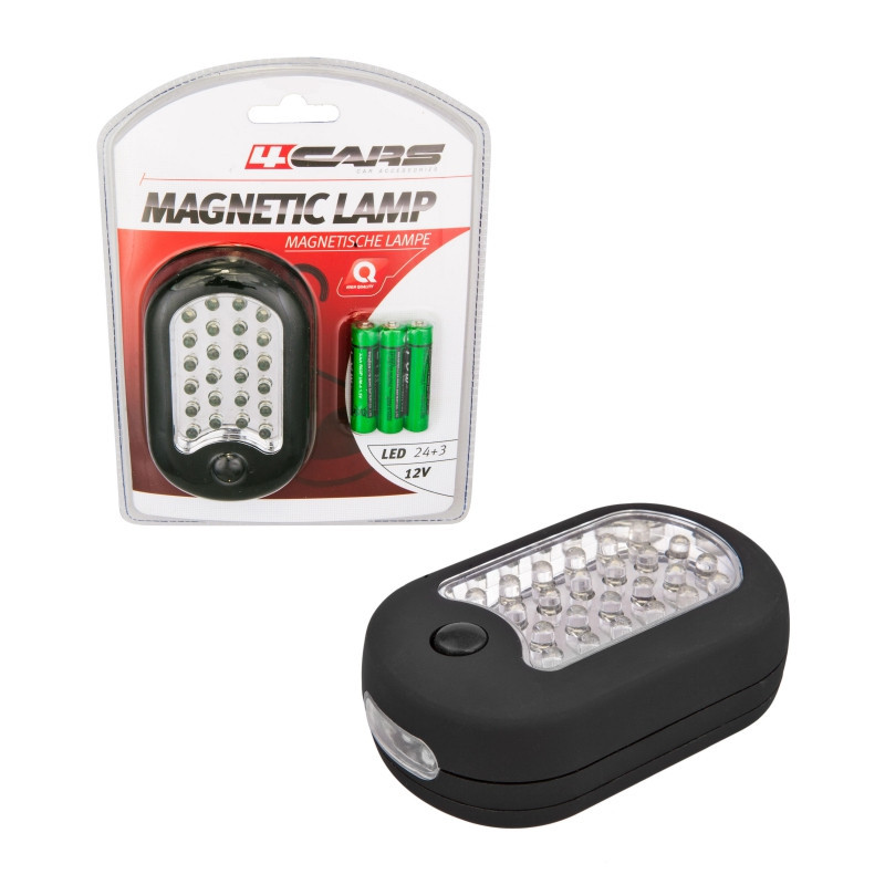 PRACOVNÍ LED LAMPA s magnetem a háčkem na boční straně k uchycení na nebo ve vozidle. Včetně 3 x AAA baterie. Maximální výkon baterií 15 hodin, LED výkon: 100.000 hodin. 24 LEDek na hlavní ploše + 3 LEDky na boční straně. 12 IM, IP 44.