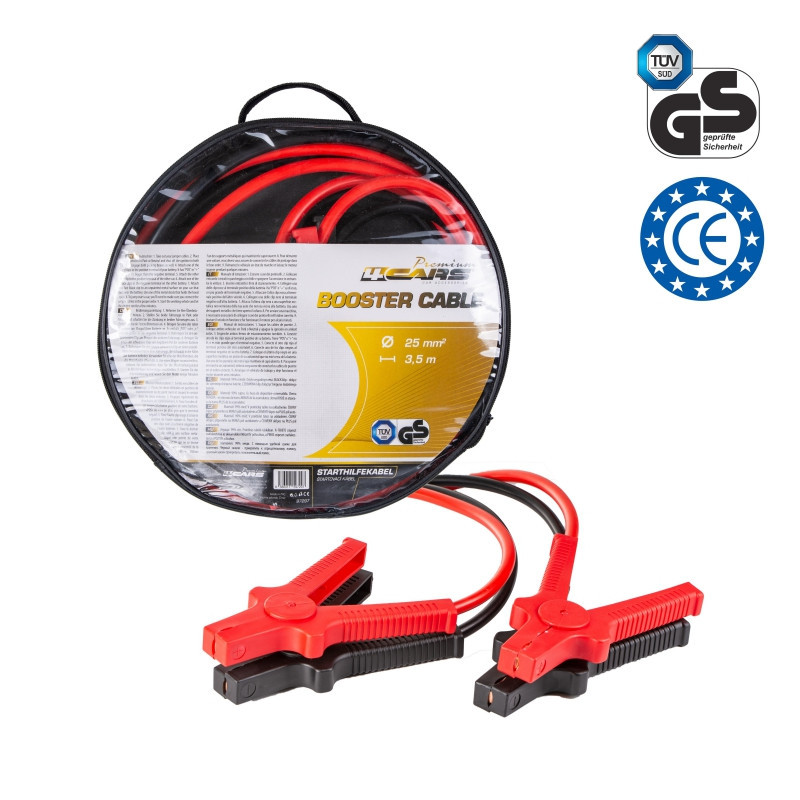 PREMIUM Startovací kabel - barevně označené izolované svorky pro snazší manipulaci, balené v praktickém obalu. Délka kabelu je 3,5m.