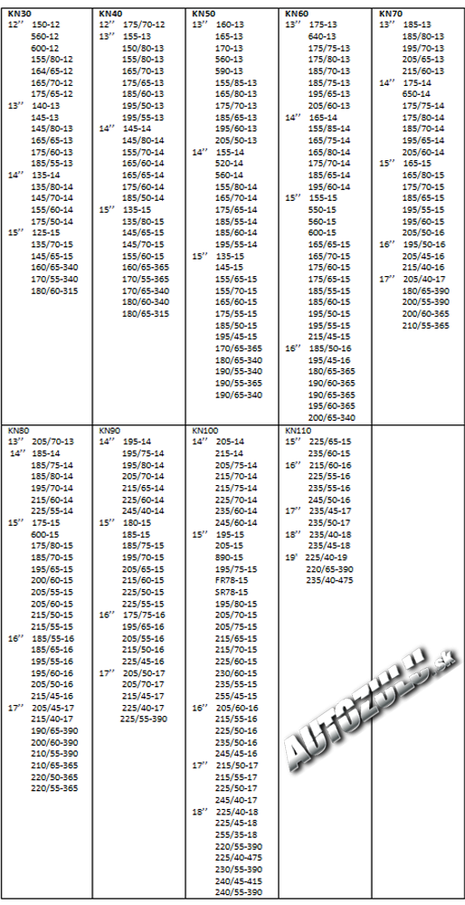 2. Najděte rozměr pneumatik a zvolte rozměr řetězů (např. máte-li 195/55R15 tedy 195 je šířka pneumatiky, 55 je boční profil, 15" je průměr pneumatiky: Zvolíte řetězy KN60)