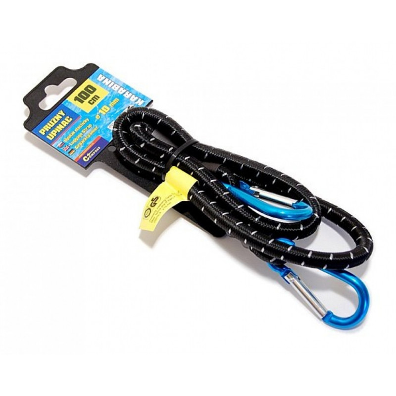 Pružný upínače vysoké kvality, zesílený, homologace TÜV/GS. Zakončeno karabinami pro dokonalé upevnění. Délka 100cm, průměr 10mm.
