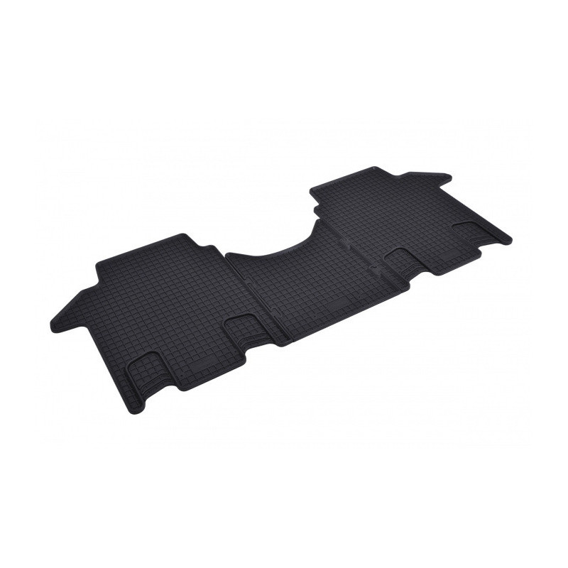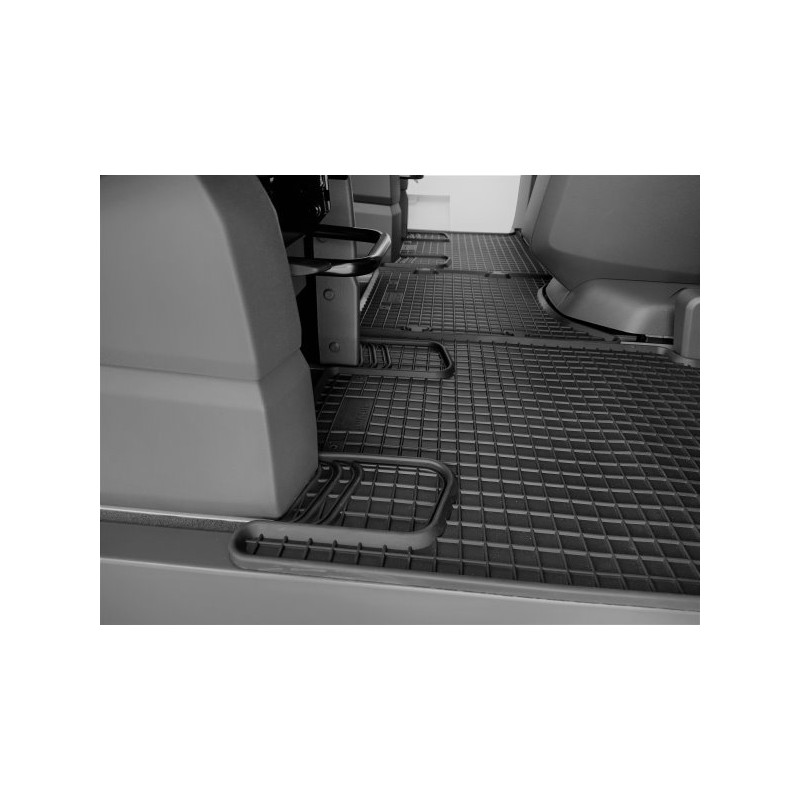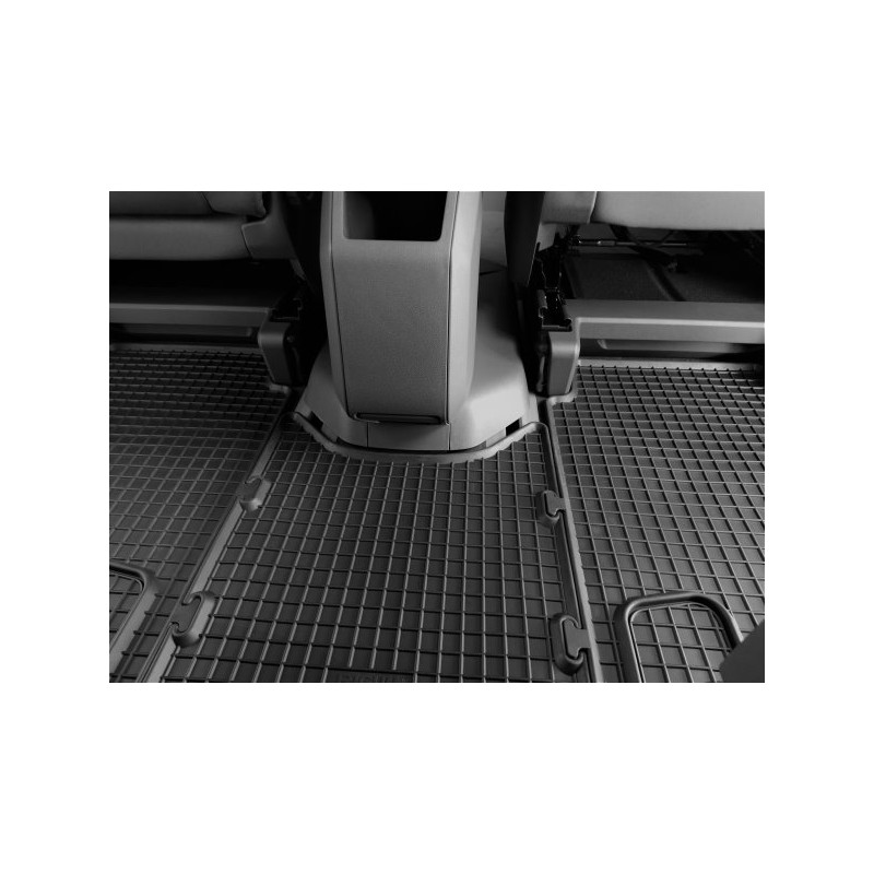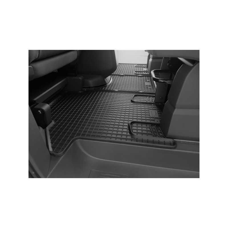 Pryžové rohože na míru pro VOLKSWAGEN T7 Multivan 2.řada (2022->). Rohože jsou vyrobeny přesně na míru interiéru daného vozidla. Levnější náhrada originálních rohoží.