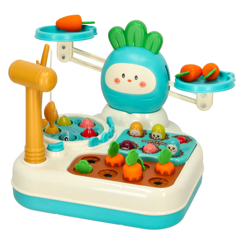 Interaktivní hračka ve tvaru mrkve je zábavná a všestranná sada, která nabízí až čtyři různé hry podporující logické myšlení, obratnost a koordinaci. Děti si mohou zahrát na rybáře, sběrače mrkví, trefovat krtky a vyvažovat váhu s barevnými prvky.