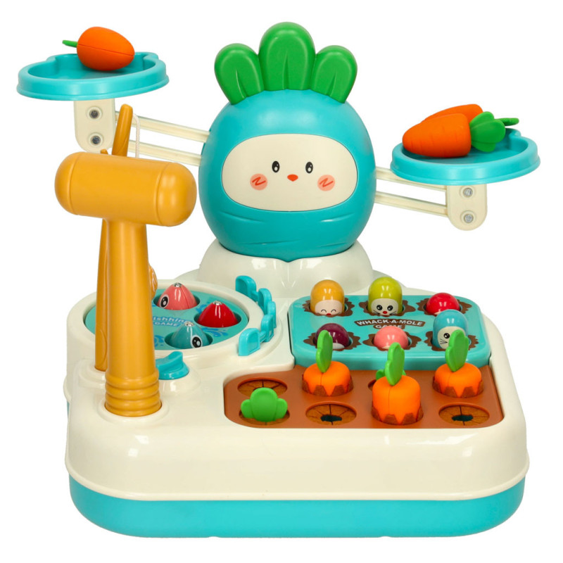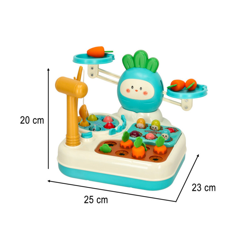 Barevné komponenty jako rybičky, mrkve a krtci dělají hru atraktivní a podněcují zvídavost dítěte. Díky přiloženému prutu, kladívku a váze bude každá hra jiná a zábavná.