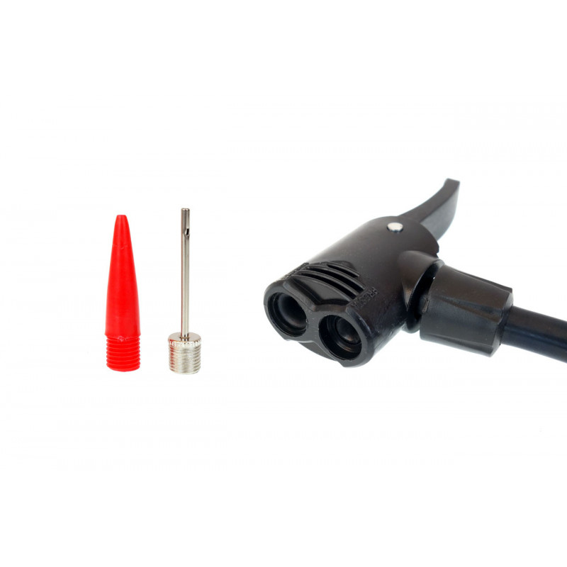 Robustní ruční hustilka s maximálním tlakem 11 BAR / 160 PSI. Má dvojitou univerzální hlavu pro ventily automobilů a kol. Kromě toho jsou součástí soupravy adaptér a jehla na nafouknutí.