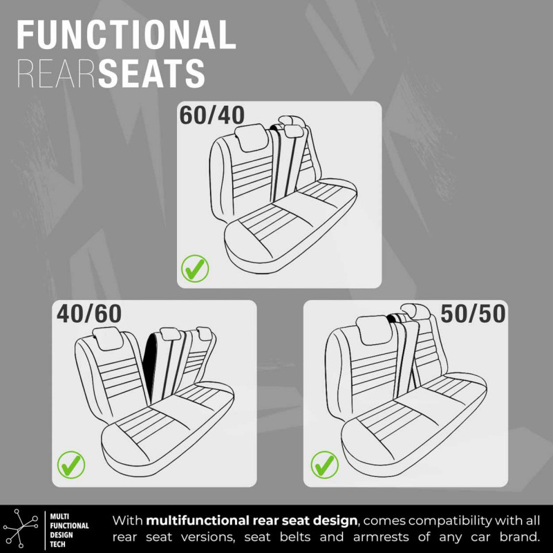 Poťahy majú zapínanie na zadnom sedadle, vďaka čomu pasujú na väčšinu sedadiel dostupných na trhu (nedelené pohovky).