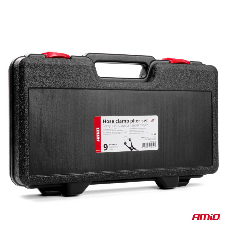 Sada kleští na hadicové spony 9 ks – AMiO-XXXX je profesionální sada nářadí určená pro efektivní demontáž a montáž různých typů hadicových spon. Ideální pro mechaniky, autoservisy a domácí kutily, kteří potřebují spolehlivé nástroje pro práci s hadicovými systémy v automobilech, motocyklech a jiných zařízeních.