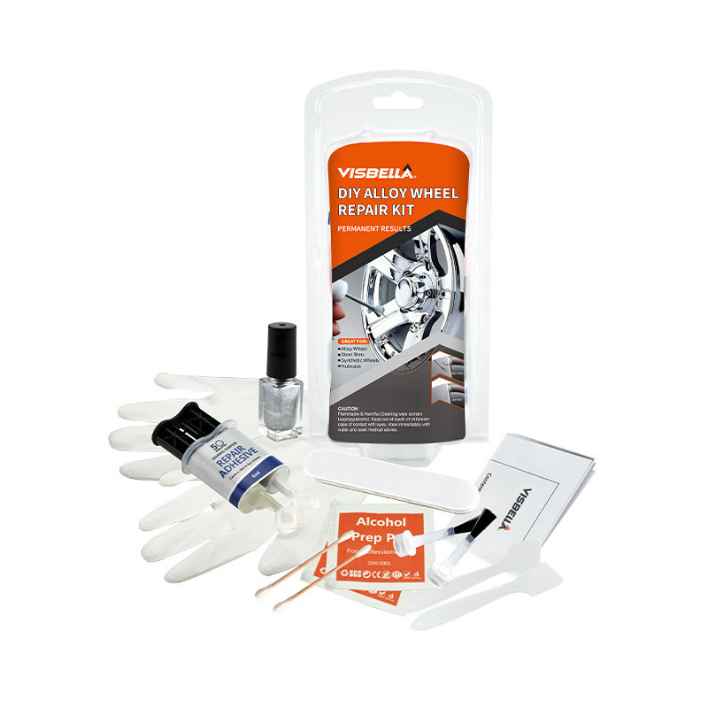 Sada na opravu kol z lehkých slitin Visbella® je určena k trvalé opravě kol po poškození obrubníky, škrábanci, malými promáčklinami, poškozením při montáži, obroušením a dalšími poškozeními kol z lehkých slitin, syntetických kol, ocelových disků a krytů kol a mnoha dalších na podobných površích. Sada obsahuje vše, co potřebujete k opravě škrábanců v krátkém čase. OBSAH SADY : 1 x 6 ml opravného lepidla 1 x 5 ml stříbrné barvy 2 x rukavice 2 x čisticí prostředky 1 x brusný pilník 2 x špachtle 2 x vatový tampon 2 x štětec 1 x návod k použití VÝHODY A VLASTNOSTI : Trvalá a snadná oprava. Tepelně odolný do 150 °C . Odolný proti vibracím, trvanlivý pro mytí automobilů. POSTUP OPRAVY : Krok 1 Pomocí brusného pilníku odstraňte všechny hrubé hrany nebo nerovnosti v okolí poškozeného místa. Krok 2 Poškozené místo očistěte čisticím prostředkem Krok 3 Zjistěte míru poškození v cílové oblasti. Zkontrolujte poškozené místo a rozhodněte, zda je třeba použít lepidlo. Pokud je poškození závažné, přejděte ke kroku 4. Pokud je poškození středně závažné, přejděte ke kroku 5. Krok 4 Rozmíchejte lepidlo pomocí přiložené špachtle. Jakmile je směs smíchána do jednolité barvy, vyplňte směsí poškozené místo pomocí špachtle a ujistěte se, že je povrch hladký. Poznámka: Doba provozu je 2-3 minuty. Smíchaná lepicí směs vytvrdne do 5 minut. Krok 5 Lakování: Poškozené místo očistěte. Pomocí dodaného štětce a barvy natřete poškozené místo. (Před použitím doporučujeme barvu protřepat.) Barvu nechte 1 hodinu zaschnout. SKLADOVÁNÍ: Výrobky by se měly skladovat nejlépe na chladném a suchém místě v uzavřených nádobách při teplotě 8 až 28 °C, pokud není uvedeno jinak. Optimální skladování je v dolní polovině tohoto teplotního rozmezí. Abyste zabránili kontaminaci nepoužitých výrobků, nevracejte žádný materiál do původního obalu. Varování: Hořlavé a zdraví škodlivé. Čisticí tampony obsahují isopropylalkohol. V případě zasažení očí je okamžitě vypláchněte vodou a vyhledejte lékařskou pomoc. UCHOVÁVEJTE MIMO DOSAH DĚTÍ .