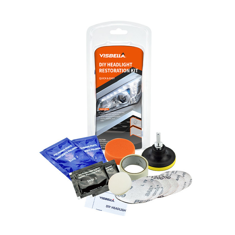 Sada na obnovu světlometů umožňuje rozsvítit a obnovit plastová skla včetně světlometů, zadních světel, mlhových světel a směrovek. Obnovením čistoty čoček se zlepší výkon světlometů a zlepší se vzhled vozidla. Sada obsahuje všechny položky potřebné k provedení práce. OBSAH SADY : 2 x 3,0 ml UV ochranné kapaliny 2x brusné kotouče P800 2 x brusné kotouče P1200 2 x brusné kotouče P2000 1 x maskovací páska (300*2 cm) 1 x oranžový houbový kotouč 2 x 40 g lešticí pasty 1 x adaptér pro brusný papír a lešticí houby (pro ruční i strojní broušení/leštění) se závitem M10 1 x bílý houbový kotouč VÝHODY A VLASTNOSTI: Navrženo pro obnovení čirého vzhledu zažloutlých, zakalených nebo zamlžených čoček světlometů. Sada pro obnovu čoček světlometů zlepšuje výkon světlometů. Tři jednoduché kroky: broušení, leštění a ochrana. Jednodušší a mnohem levnější než výměna starého světlometu. Dodává se s návodem pro snadné použití. Obnovuje světlomety, zadní světla, mlhová světla nebo směrovky. Tato sada je určena k obnově 2 světlometů. POSTUP OPRAVY : Příprava: Očistěte čočku světlometu vodou. Okolní obvod čočky zakryjte páskou, aby nedošlo k poškrábání laku vozidla Existují dva způsoby broušení a leštění : ruční nebo strojní, strojní má samozřejmě lepší výsledek (pomocí brusky nebo vrtačky). Krok 1. PÍSKOVÁNÍ Navlhčete brusný kotouč a připevněte jej k adaptéru. Brousíme třemi různými zrnitostmi, abychom zcela odstranili silné zažloutnutí, vyblednutí a korozi. Poznámka: Používejte brusné kotouče od hrubého po jemný: P800 --> P1200 --> P2000. V opačném případě dojde k selhání restaurování. Při broušení se doporučuje světlomet průběžně postřikovat vodou. Krok 2. LEŠTĚNÍ Připevněte oranžový houbový kotouč k adaptéru a naneste na něj lešticí pastu. Leštěte čočku, dokud se její lesk nevrátí do původního stavu. Poznámka: Pro dosažení nejlepších výsledků použijte elektrickou vrtačku nebo elektrickou leštičku. Pokud leštíte ručně, leštěte nejméně 200 tahy krouživým pohybem ve směru hodinových ručiček. Krok 3. OCHRANA Před pokračováním v tomto kroku očistěte čočku světlometu a ujistěte se, že je suchá. Ujistěte se, že světlomet není vystaven přímému slunečnímu světlu (VELMI DŮLEŽITÉ). Pomocí bílého houbového kotouče dodaného v sadě naneste rovnoměrně vrstvu ochranné kapaliny na povrch čočky. Nechte ochrannou kapalinu působit a zasychat po dobu 15 minut. Poté nechte kapalinu vytvrdnout na přímém slunečním světle po dobu 1 až 2 hodin. Po provedení kroku 3 udržujte čočku v suchu a nevystavujte ji vlhkosti. Vůz nemyjte po dobu 24 hodin. Varování: Může způsobit podráždění očí a pokožky. V případě zasažení očí je okamžitě vypláchněte vodou a vyhledejte lékařskou pomoc. UCHOVÁVEJTE MIMO DOSAH DĚTÍ .