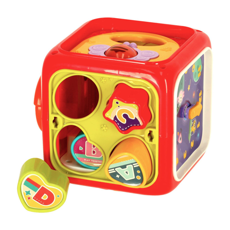 Sada navíc obsahuje čtyři kostky různých tvarů, které dítě vkládá do správných otvorů v třídiči.