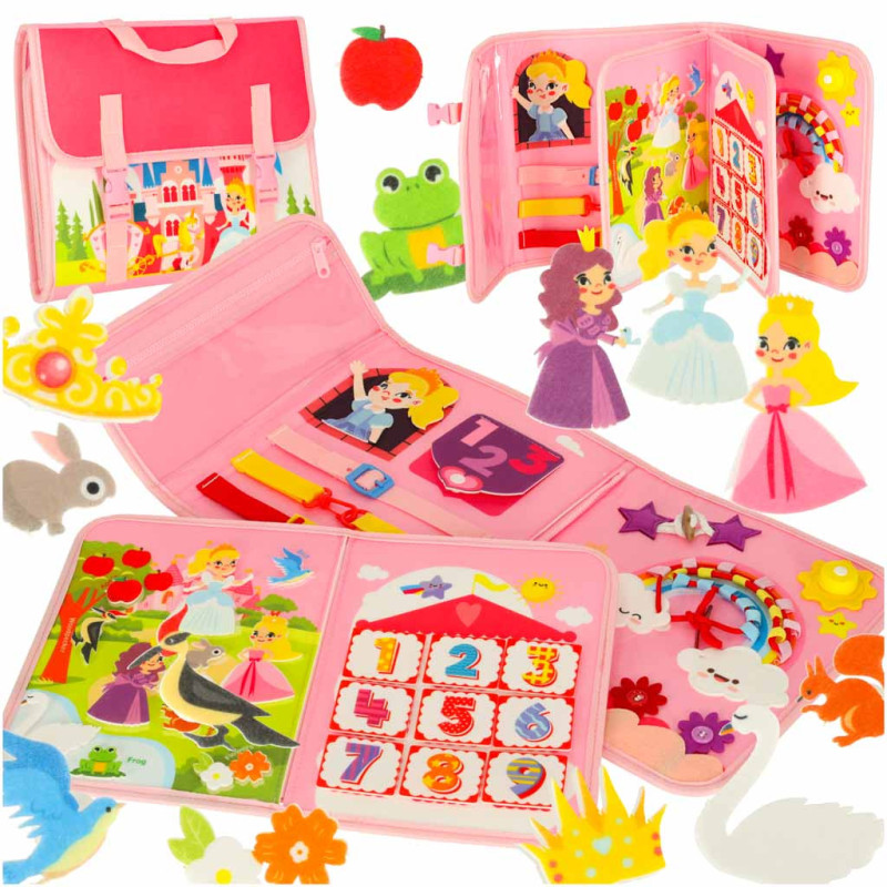 Růžová manipulační tabule Montessori s motivem princezen rozvíjí dětské dovednosti a zároveň je vtahuje do světa fantazie. Je ideální volbou jako dárek pro malé princezny – ať už k narozeninám, na Vánoce nebo jako pomůcka na cesty.