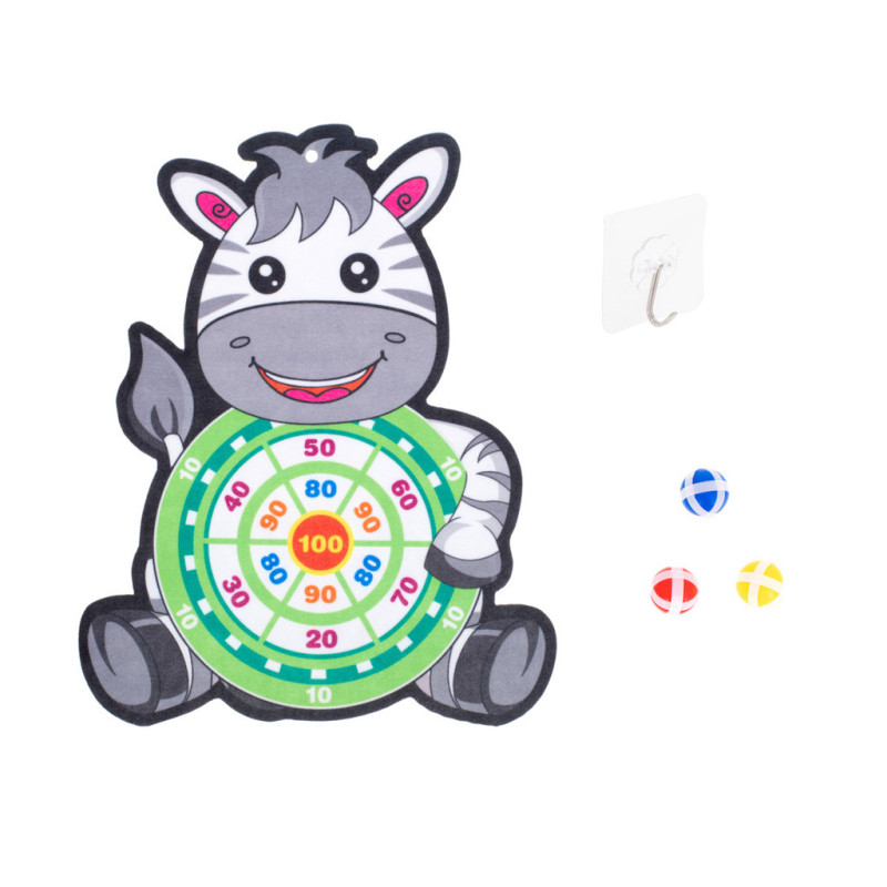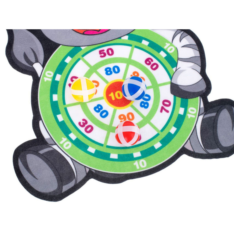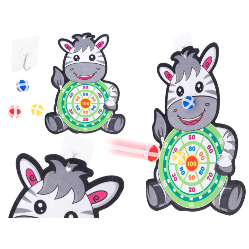Terč ve tvaru přátelského zvířete a plastové míčky se suchým zipem jsou vše, co potřebujete k zahájení fantastické hry. Terč můžete snadno připevnit na zeď nebo jiný rovný povrch pomocí samolepicího závěsu, který je součástí sady.