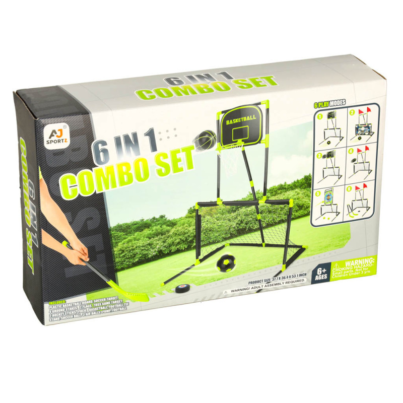 Vyberte si sportovní soupravu 6v1 - jeden základ, mnoho možností! Fotbal, basketbal, hokej, ragby, ale i trénink na terč - to vše nabízí naše sada. Nemusíte kupovat samostatné branky pro každý sport zvlášť - díky modulární konstrukci můžete fotbalovou branku jednou a dvakrát přeměnit na terč pro trénink přesnosti nebo basketbalový koš. Navíc se také nemusíte starat o nákup potřebného tréninkového vybavení. Veškeré potřebné příslušenství již máte v sadě: tři nafukovací míče (na fotbal, basketbal a ragby), plastové míče na trénink na terč, puk a hokejky, a dokonce i sítě, pumpu a plastové kolíky na ukotvení branky.