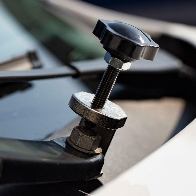 Princip činnosti: tvarované čelisti zachycují ramínko stěrače, pomocí šroubu se ramínko vysouvá z objímky.