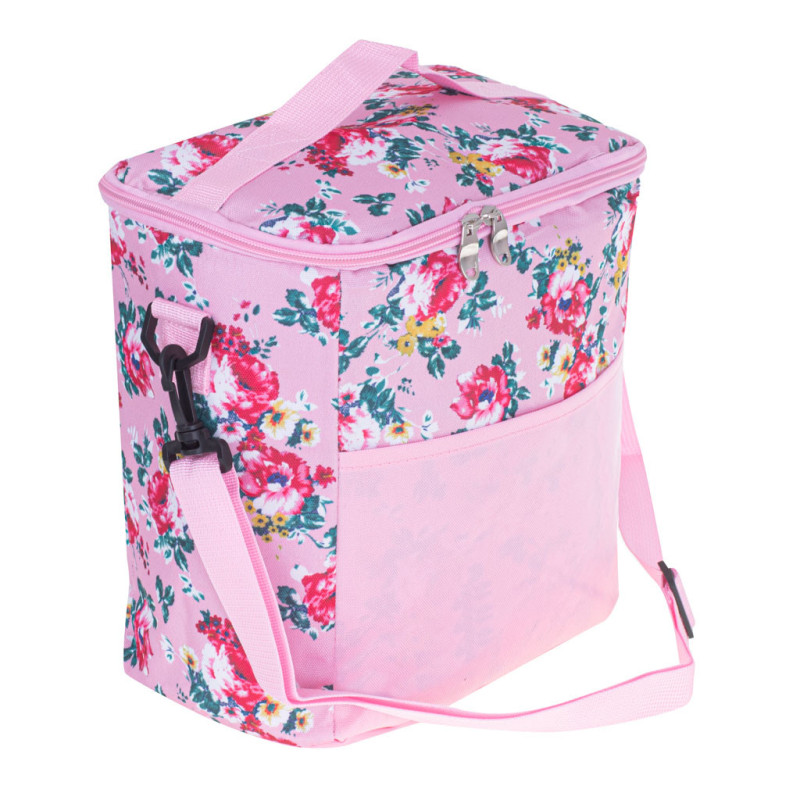 Termo taška na oběd na plážový piknik 11L, růžová s květinami.